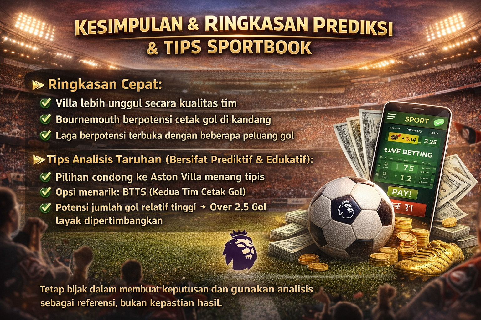 Jika Villa mampu mencetak gol lebih dulu, mereka berpeluang mengontrol jalannya laga. Namun jika Bournemouth bertahan solid dan memanfaatkan serangan balik, kejutan tetap mungkin terjadi.