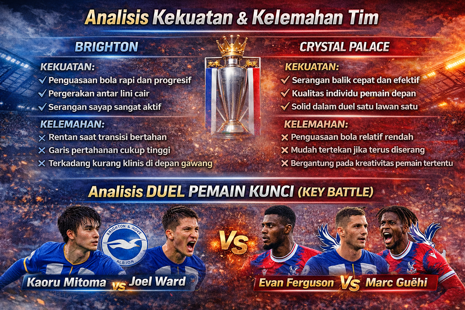 Derbi Pantai Selatan kembali menjanjikan pertandingan penuh tensi dan gengsi. Brighton memiliki keunggulan dari sisi organisasi permainan dan keuntungan bermain di kandang, namun Crystal Palace tetap berbahaya dengan serangan balik dan kualitas individu pemain depannya.