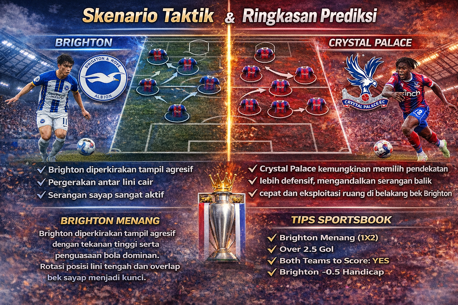 Melihat performa kedua tim yang cenderung seimbang namun dengan karakter bermain yang berbeda, laga ini diprediksi berlangsung ketat. Brighton berpotensi lebih dominan dalam penguasaan bola, sementara Crystal Palace mengancam lewat serangan balik cepat.