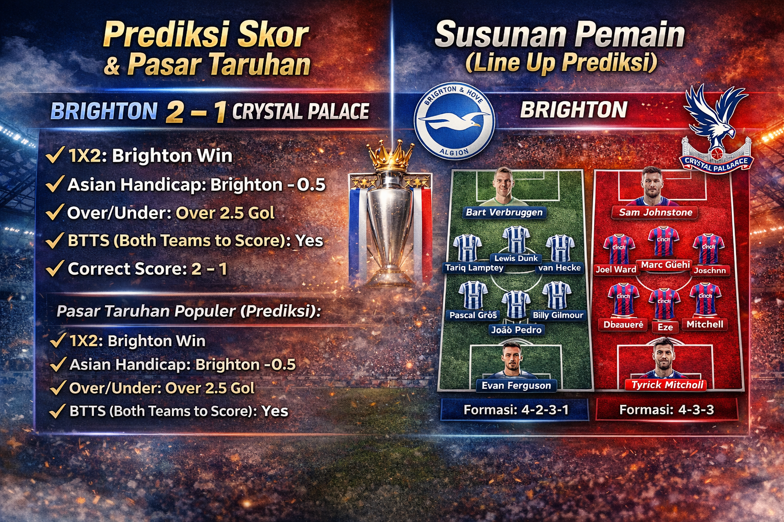 Dengan ambisi masing-masing untuk memperbaiki posisi di klasemen Liga Inggris, laga Brighton vs Crystal Palace dipastikan berlangsung sengit dan penuh drama. Siapa pun pemenangnya, derbi ini sekali lagi menegaskan bahwa rivalitas lokal tetap menjadi salah satu daya tarik terbesar dalam sepak bola modern.Prediksi Skor Brighton vs Crystal Palace & Pasar Taruhan