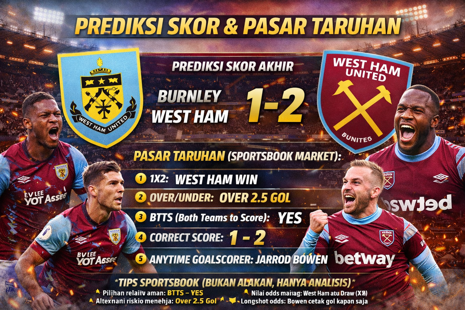 Pertandingan Burnley vs West Ham diperkirakan berlangsung sengit dengan tempo sedang hingga tinggi. Burnley memiliki keunggulan sebagai tuan rumah, namun West Ham unggul dalam pengalaman, efektivitas serangan, dan kualitas individu pemain.