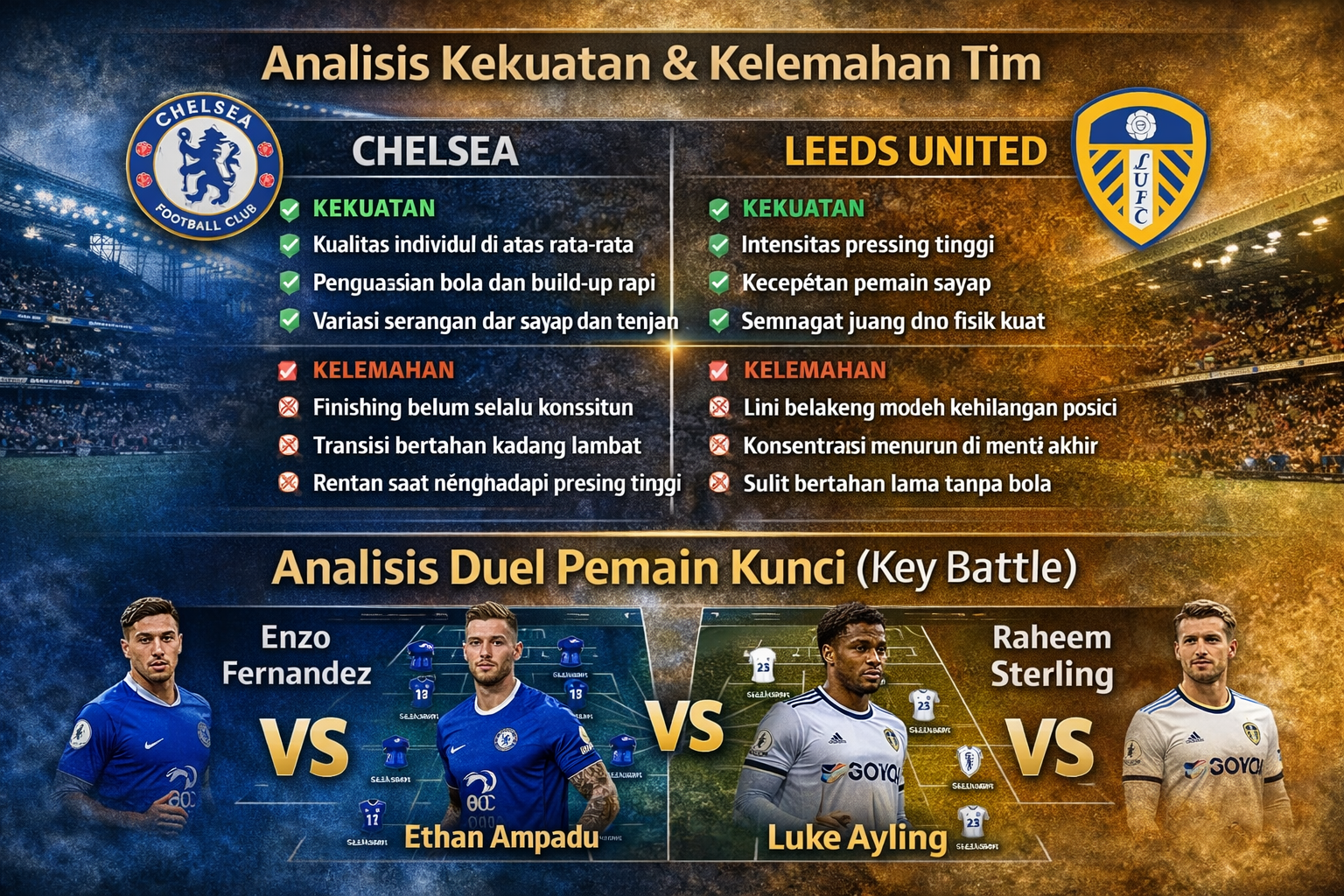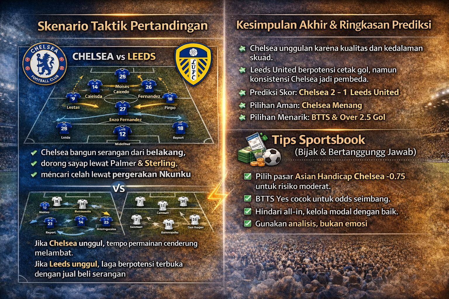 Jika Chelsea unggul lebih dulu, tempo pertandingan cenderung melambat. Namun, jika Leeds mencetak gol lebih awal, laga berpotensi berlangsung terbuka dengan jual beli serangan.