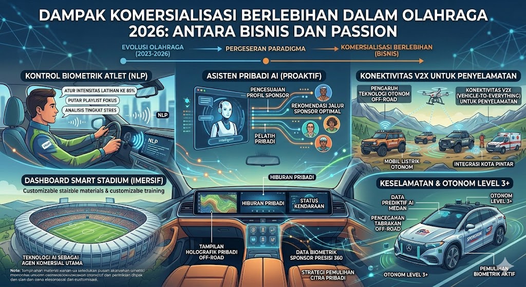 [Image 46: Inovasi Latihan Atlet 2026, adapted for 2026, showing the transition from New Rich Clubs to 2026-relevant data points in each panel: Panel 1: “KENDARAAN KECIL & EFISIEN” with icons of diverse high-performance commercialized sports equipment (smart sensors, biomechanical suits). Panel 2: “RAMAH LINGKUNGAN OFF-ROAD” adapted to “ECO-FRIENDLY COMMERCIALIZATION” showing sustainable materials and sustainable business models. Global perspective: “GLOBAL ECOSYSTEM EXPANSION” and “TRANS-CONTINENTAL PLAYER TRANSFER” adapted to 2026. Title is clearly transformed: “REVOLUSI KOMERSIALISASI OLAHRAGA 2026” with relevant subtitling.]