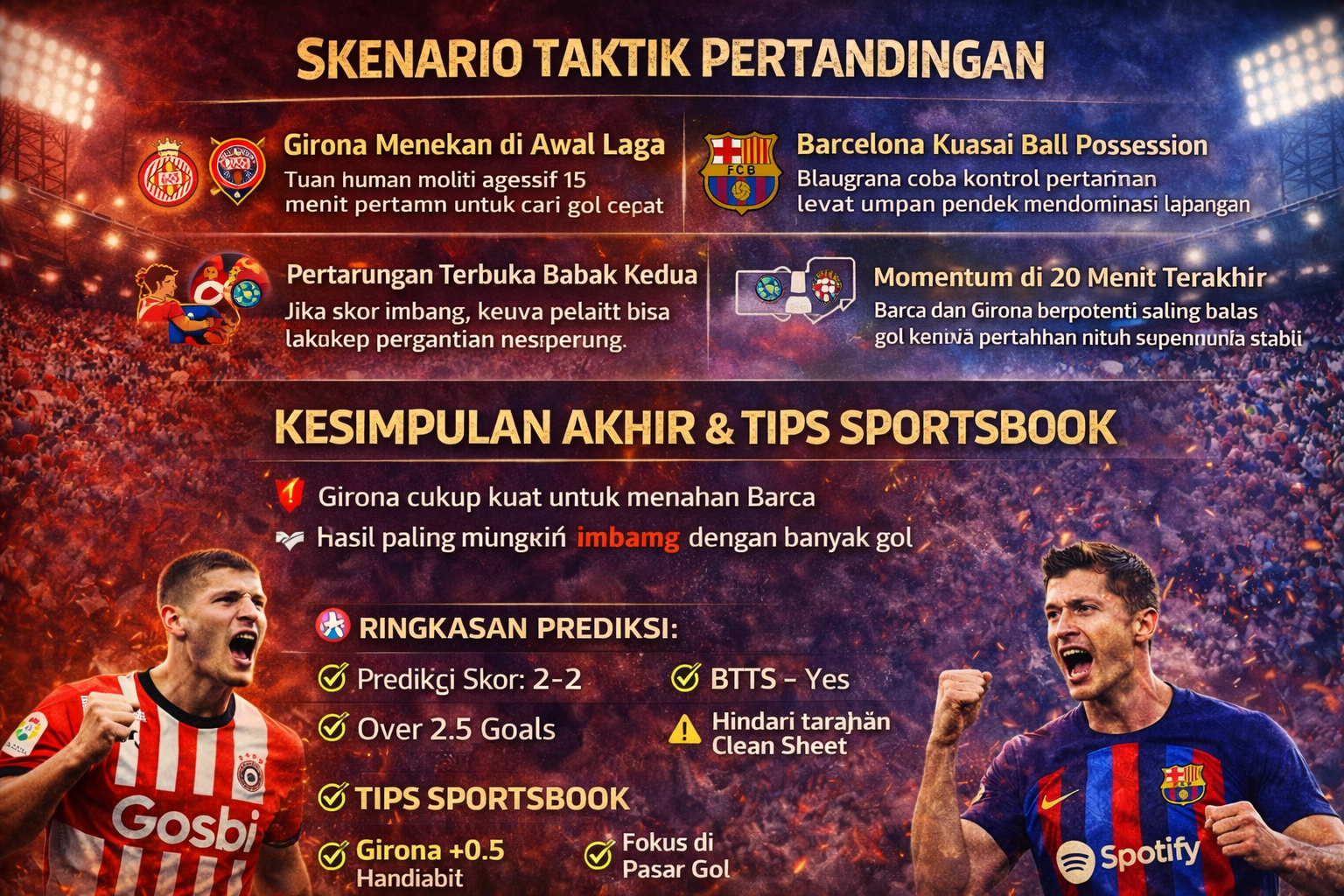 Hasil paling realistis adalah imbang dengan banyak gol. Girona cukup solid untuk menahan Barcelona, tetapi tidak mudah menghentikan produktivitas lini depan tim tamu.