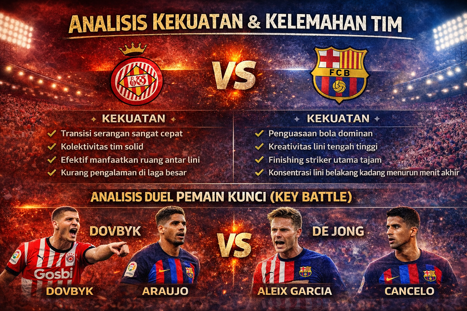 Striker Girona akan berhadapan langsung dengan bek tangguh Barcelona. Jika Dovbyk mampu menang duel udara dan positioning, Girona berpeluang mencetak gol cepat.