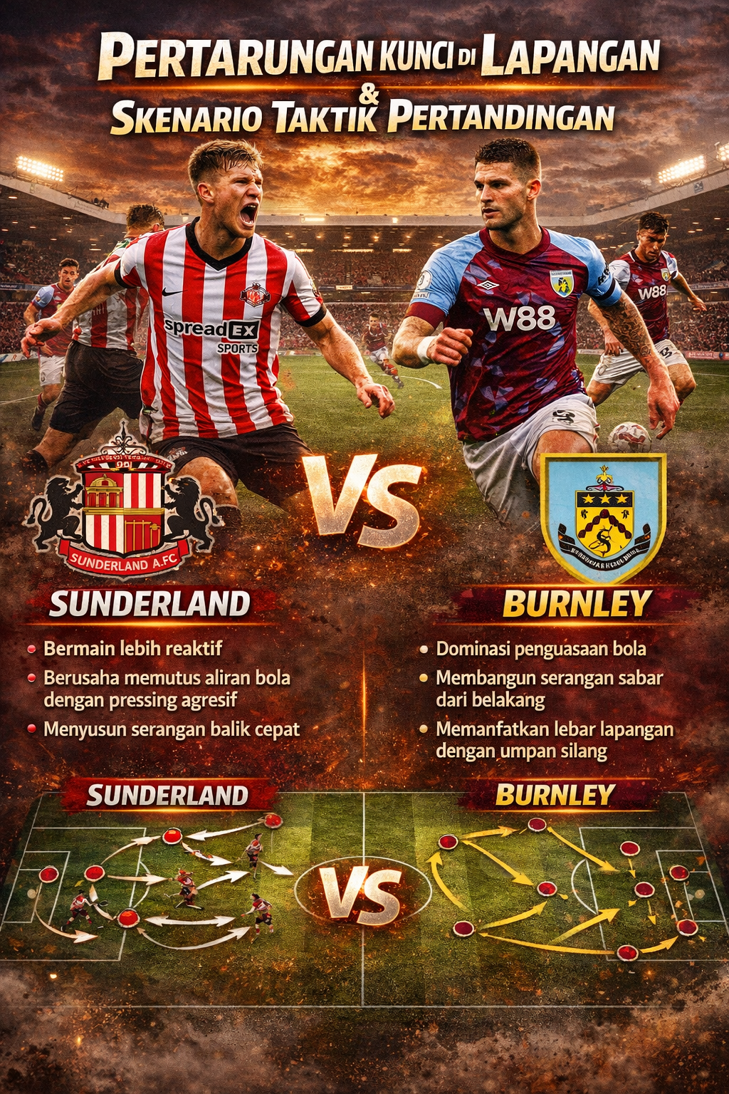 Di sektor sayap, kecepatan pemain Sunderland bisa menjadi senjata utama untuk mengeksploitasi ruang di belakang bek Burnley yang gemar naik membantu serangan. Namun, jika Burnley mampu mengontrol ritme dan menekan lebih dulu, Sunderland bisa dipaksa bermain lebih bertahan dari biasanya.