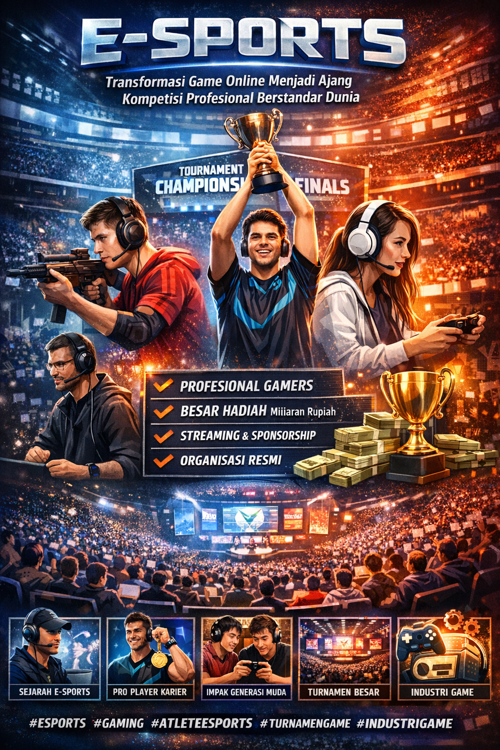 Dalam beberapa tahun terakhir, dunia olahraga mengalami revolusi besar dengan hadirnya E-Sports (Electronic Sports). Jika dulu bermain video game hanya dianggap sebagai hiburan semata, kini E-Sports telah berkembang menjadi cabang olahraga profesional yang diakui secara global. Turnamen besar dengan hadiah miliaran rupiah, tim profesional, hingga pelatihan intensif menjadikan E-Sports setara dengan olahraga tradisional.