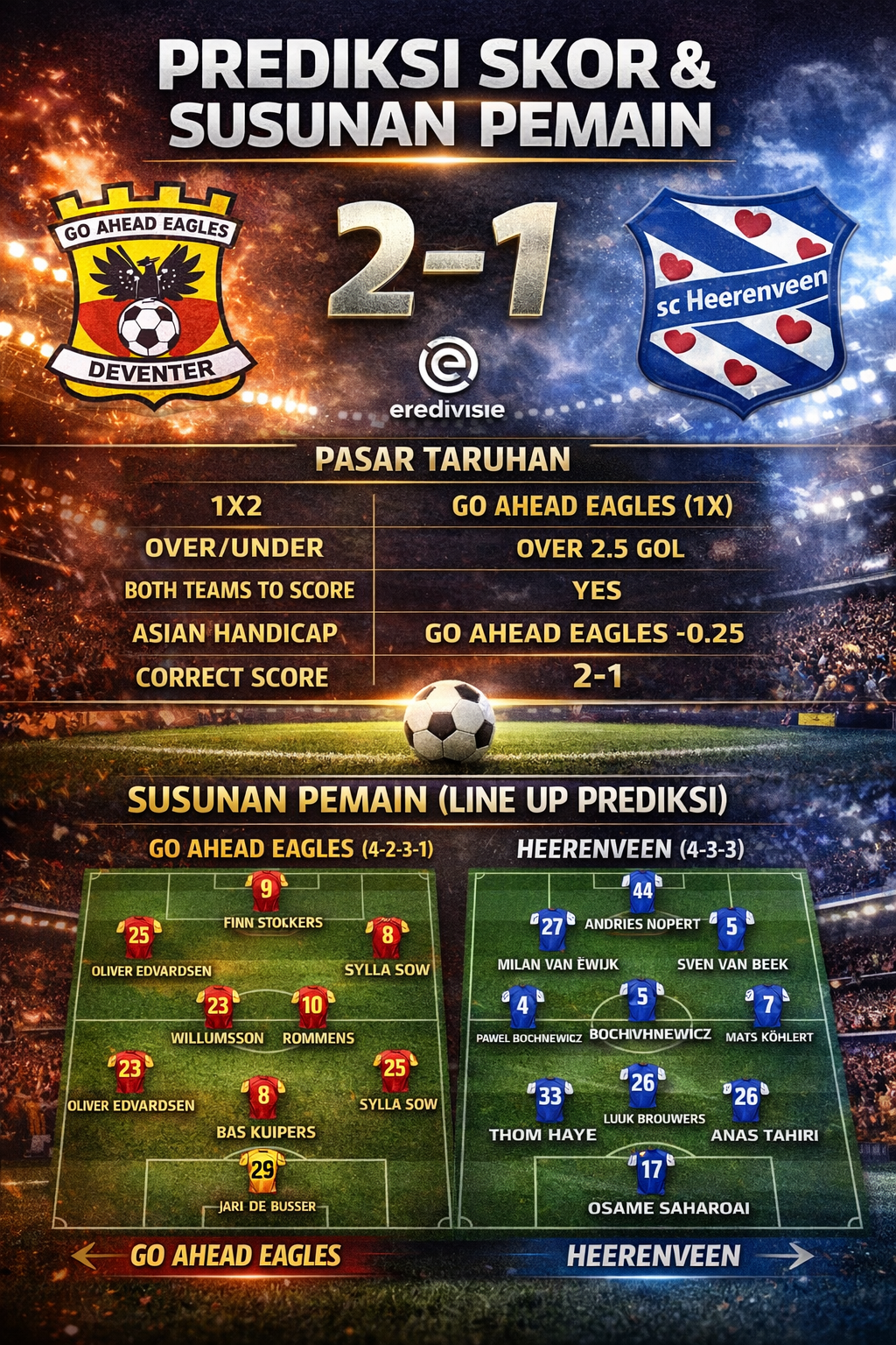 Pertandingan GO Ahead Eagles vs Heerenveen diprediksi berlangsung sengit dan menarik. Keunggulan kandang memberi nilai plus bagi GO Ahead Eagles, namun Heerenveen tetap berbahaya dengan pengalaman dan kualitas individu pemainnya.