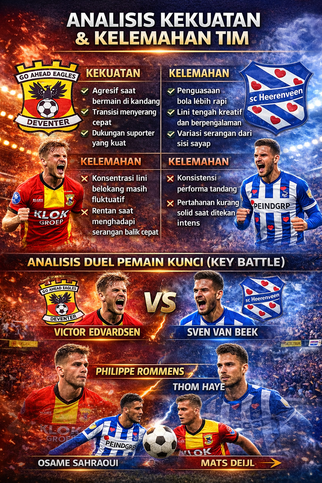 Duel lini tengah diperkirakan menjadi kunci jalannya pertandingan. GO Ahead Eagles akan mencoba mendominasi tempo permainan sejak awal, sementara Heerenveen kemungkinan memilih pendekatan lebih sabar dengan mengandalkan serangan balik cepat. Adu strategi antara kedua pelatih juga menjadi salah satu aspek menarik yang patut dinantikan.