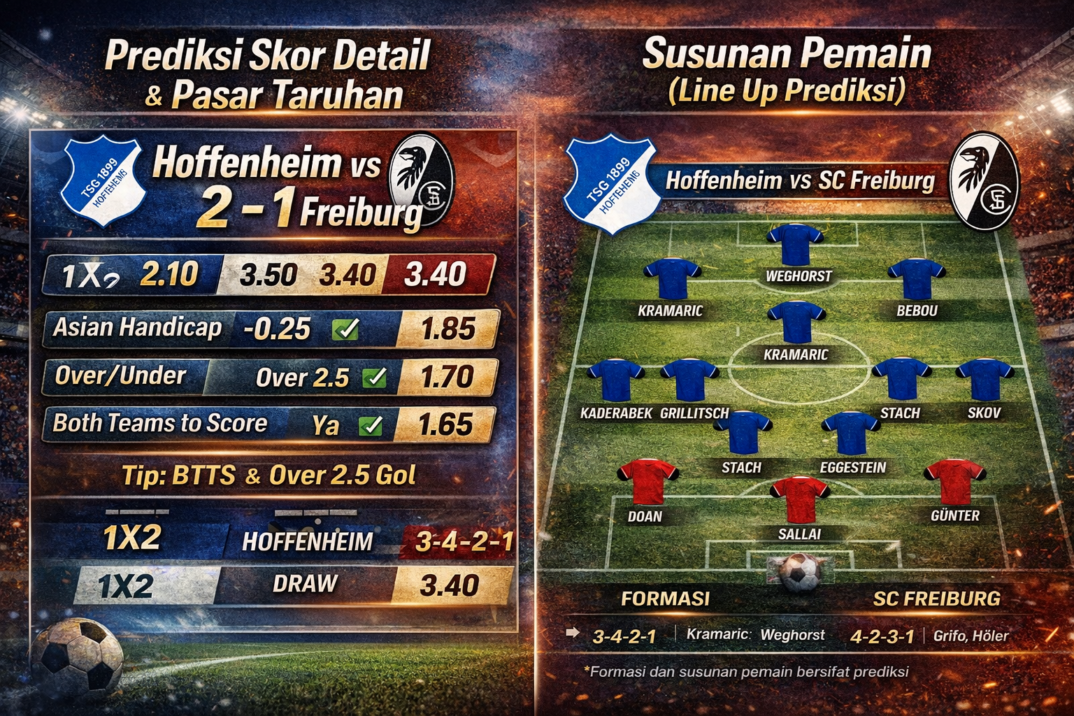 Pertandingan antara TSG 1899 Hoffenheim dan SC Freiburg dalam lanjutan Bundesliga diprediksi berlangsung ketat dengan duel taktik yang menarik. Berikut ulasan lengkap mulai dari prediksi skor, line up, hingga rekomendasi pasar taruhan.