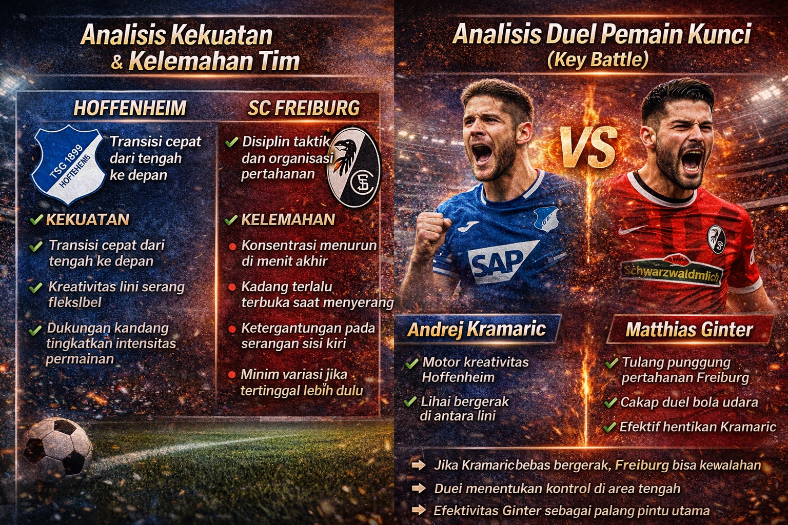 Kramaric menjadi motor kreativitas Hoffenheim dengan kemampuan mencari ruang di antara lini. Sementara Ginter berperan penting menjaga kedalaman pertahanan Freiburg. Jika Kramaric mampu lepas dari pengawalan, Freiburg bisa kesulitan.