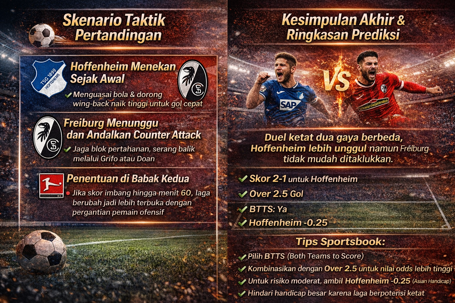 Duel ini mempertemukan dua tim dengan gaya berbeda: Hoffenheim yang agresif dan Freiburg yang pragmatis. Keunggulan kandang serta intensitas serangan membuat Hoffenheim sedikit lebih di atas kertas.