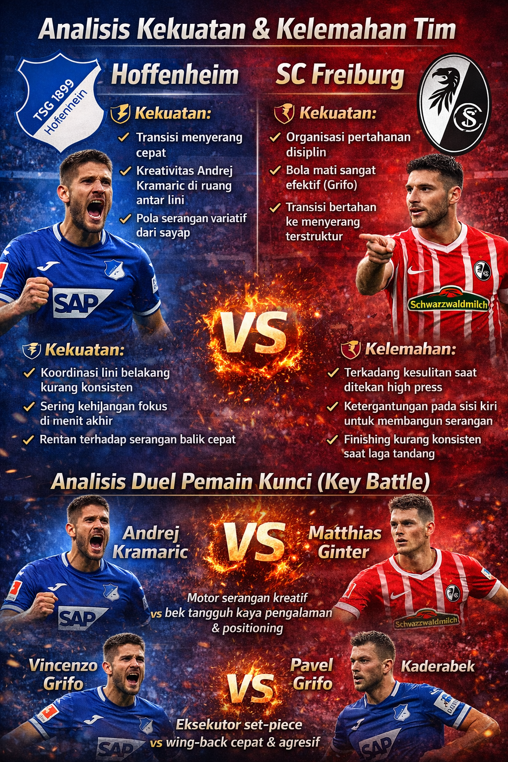 Kramaric menjadi motor serangan Hoffenheim. Pergerakannya di antara bek dan gelandang bertahan akan diuji oleh pengalaman serta positioning Ginter. Jika Ginter mampu membatasi ruang tembak Kramaric, Freiburg bisa mengontrol tempo.