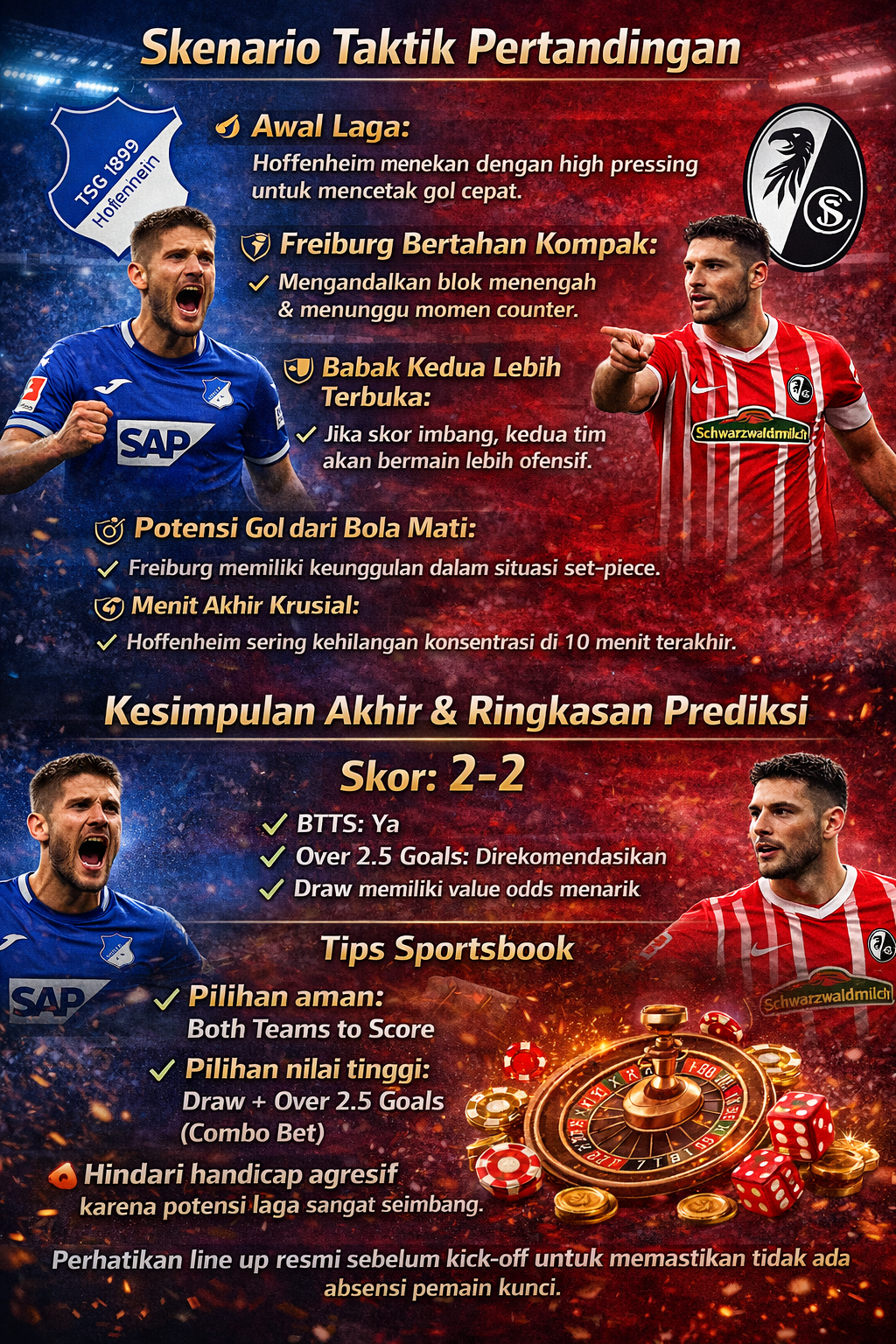 Hoffenheim kemungkinan unggul lebih dulu lewat skema open play. Freiburg merespons melalui serangan balik atau bola mati. Laga diprediksi berlangsung terbuka dengan intensitas tinggi hingga akhir.