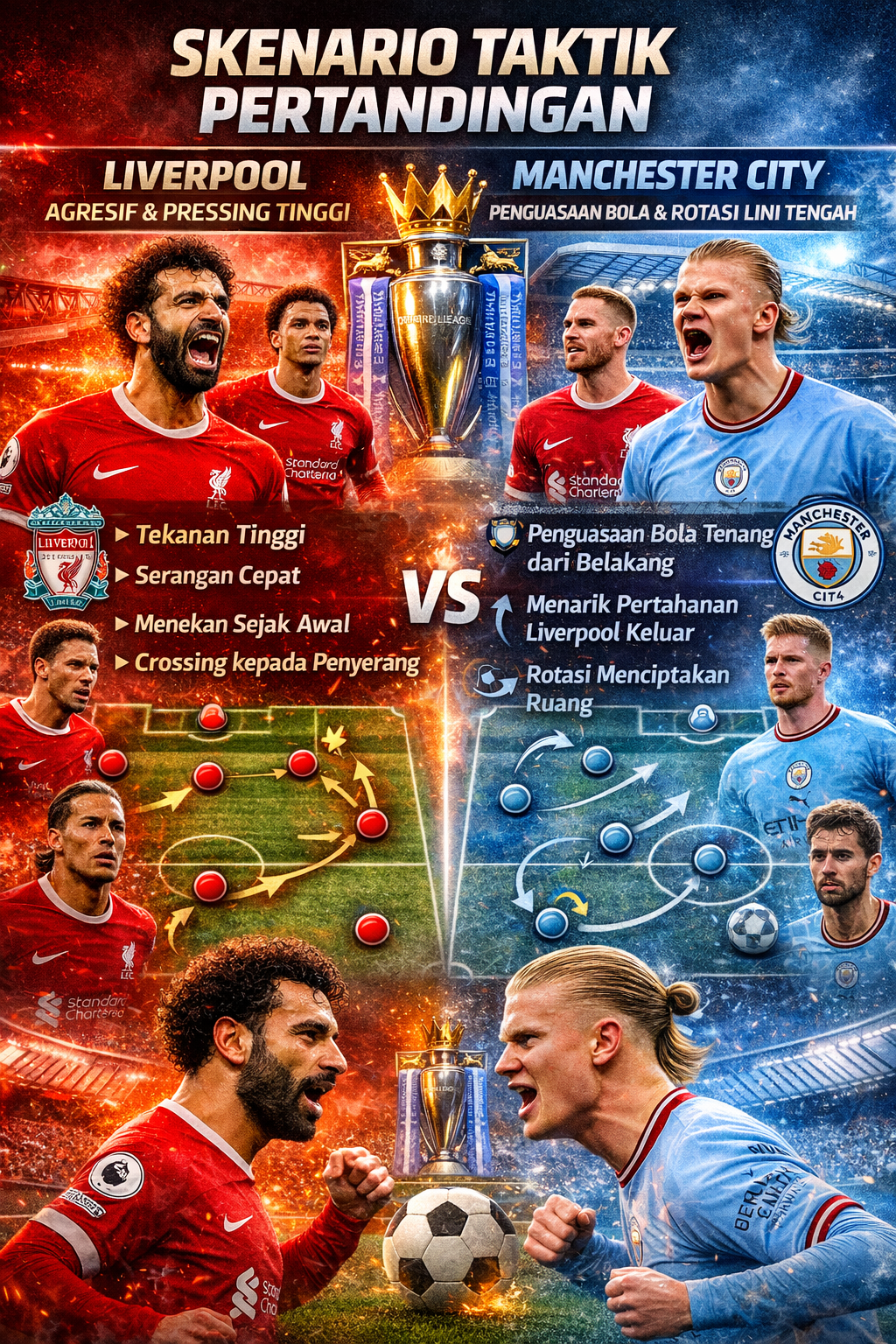 Pertarungan fisik dan positioning kelas dunia. Jika Van Dijk gagal membaca pergerakan Haaland, City bisa sangat berbahaya di kotak penalti.