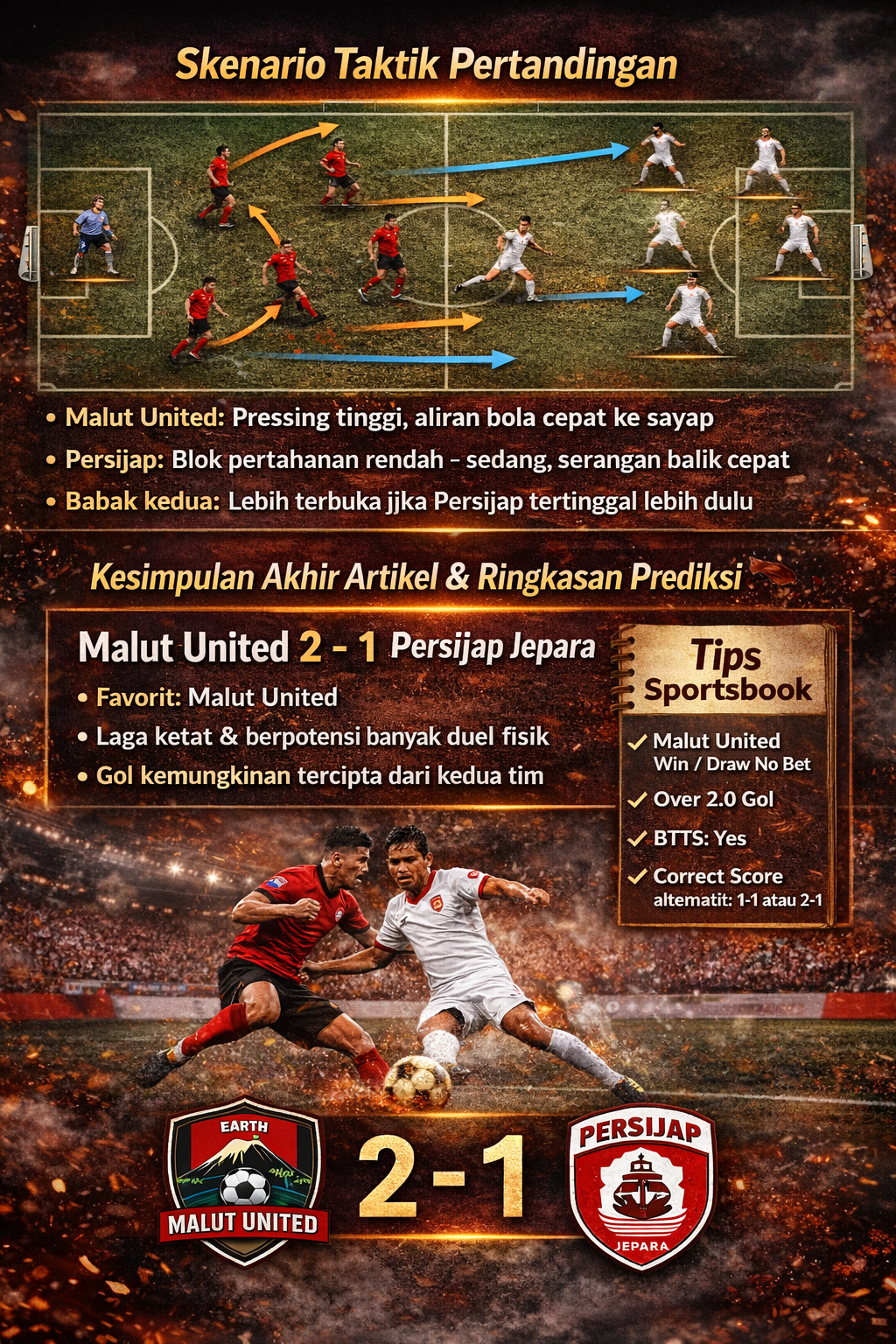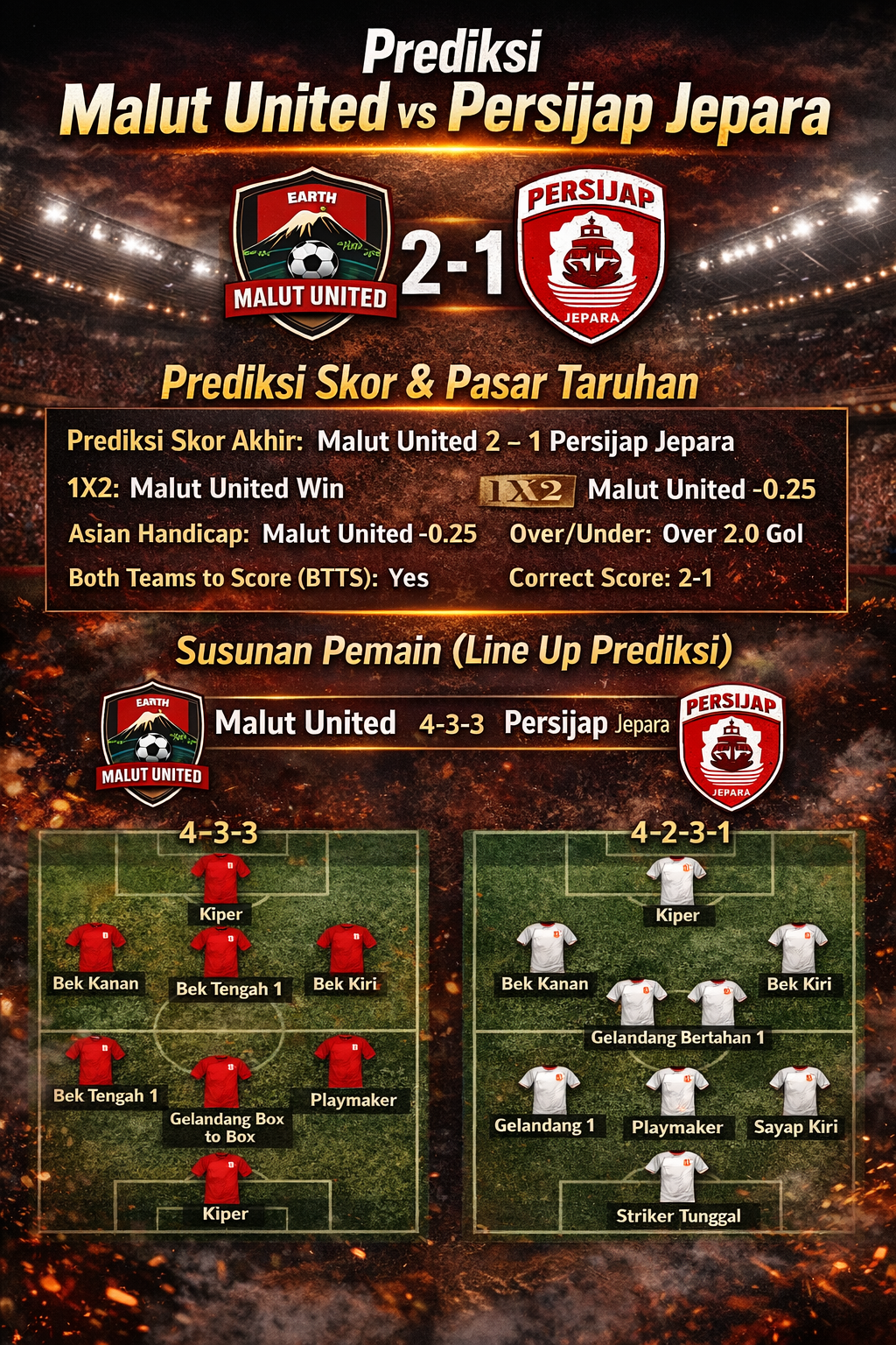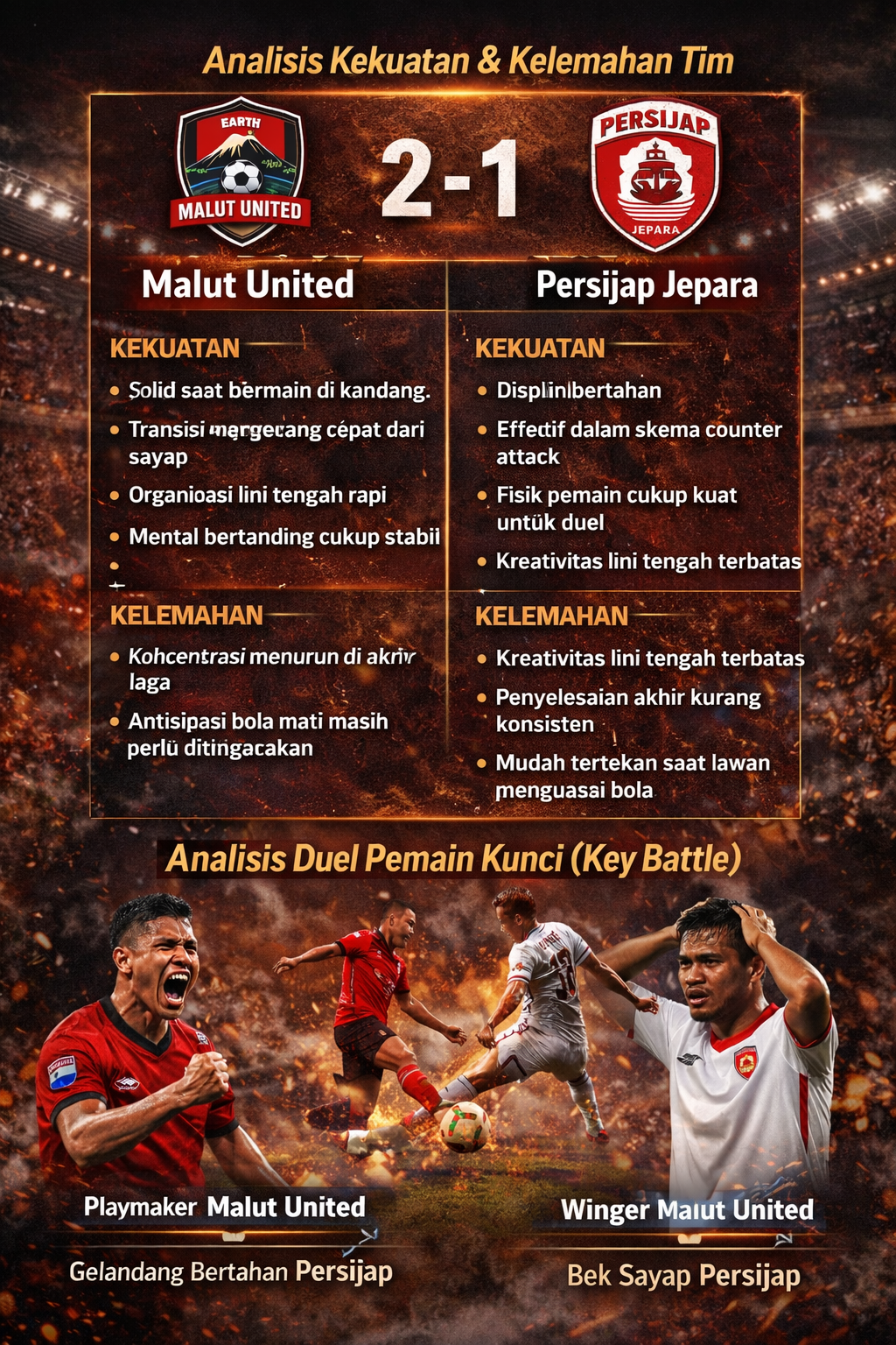 Pertandingan Malut United vs Persijap Jepara diprediksi berlangsung sengit dengan perbedaan kualitas yang tidak terlalu jauh. Keunggulan kandang, kestabilan permainan, dan kreativitas lini tengah membuat Malut United lebih diunggulkan untuk meraih kemenangan tipis.