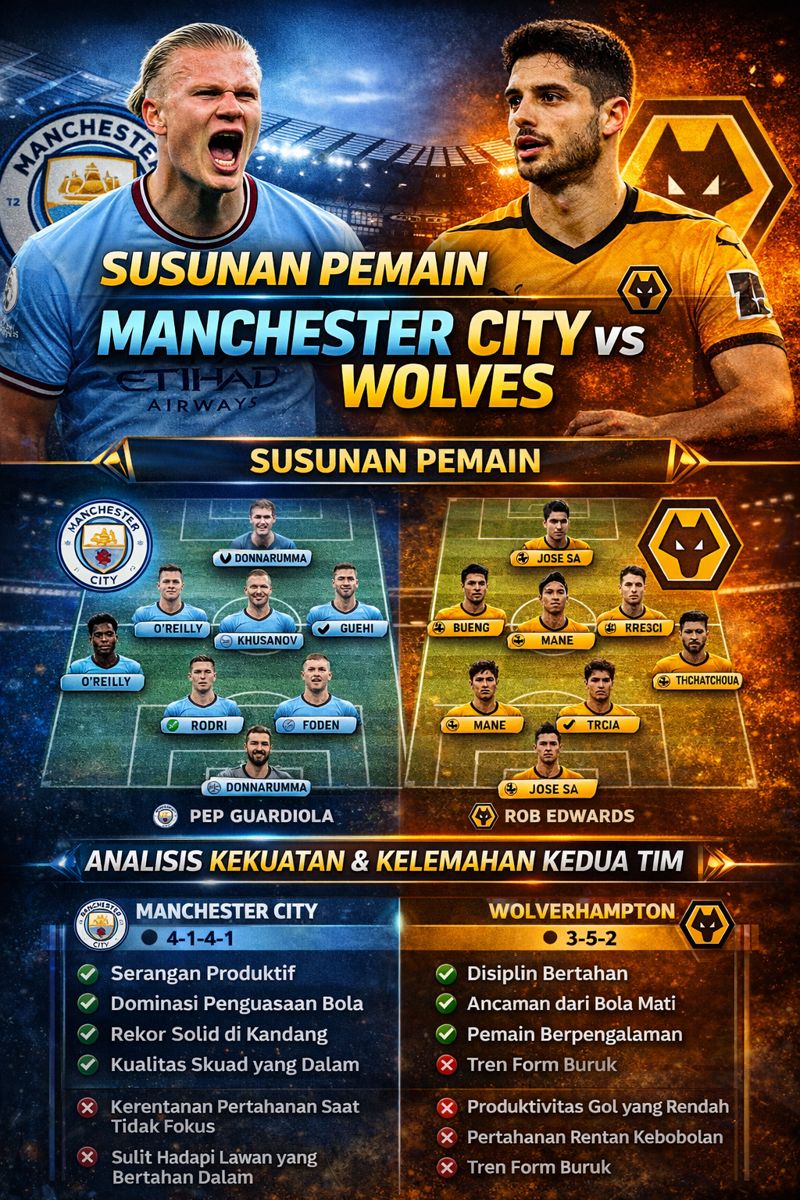 Di sisi lain, Wolverhampton Wanderers datang sebagai underdog, namun bukan tanpa ancaman. Wolves kerap tampil disiplin saat menghadapi tim besar, mengandalkan transisi cepat dan serangan balik tajam. Jika City lengah, tim tamu berpotensi mencuri gol dari situasi counter attack maupun bola mati.