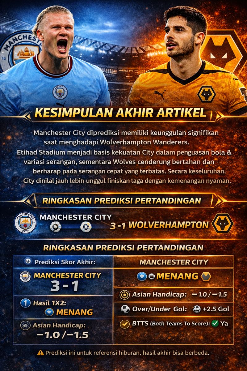 Melihat performa terkini dan rekor pertemuan kedua tim, Manchester City memiliki peluang besar untuk mengamankan kemenangan. Namun, Wolverhampton tetap bisa memberi perlawanan sengit jika mampu bertahan solid dan memaksimalkan peluang terbatas.