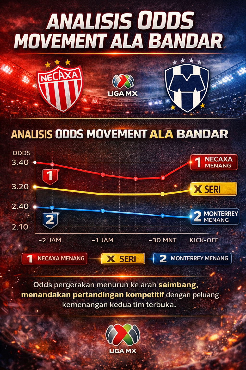 - Odds kemenangan Necaxa dan Monterrey berada nyaris seimbang sebelum pertandingan. Ini berarti bandar melihat bahwa laga tersebut terbuka dan tidak ada favorit sangat beratβmeski secara historis Monterrey lebih dominan di head-to-head.