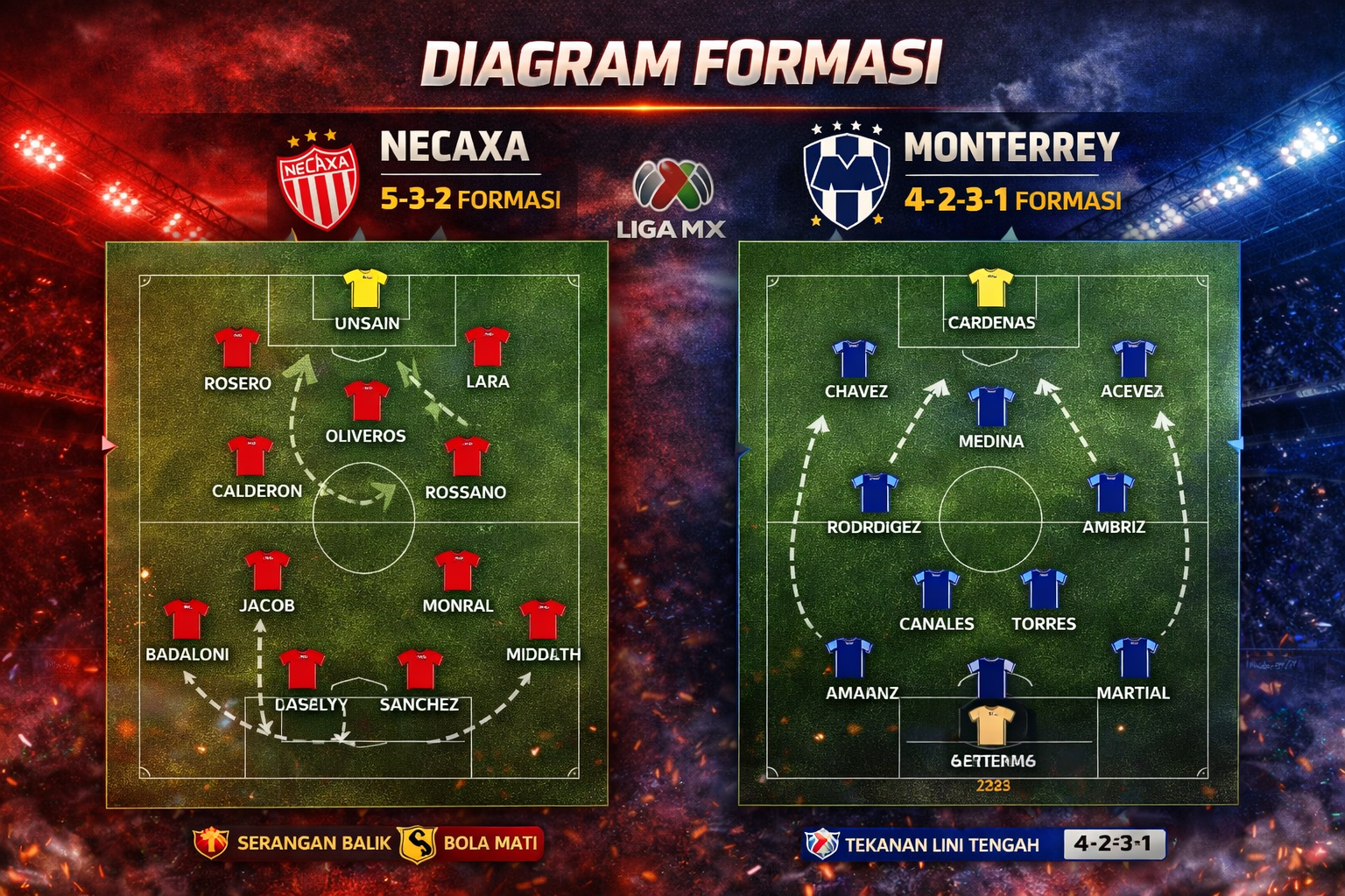 π‘ Jacob, Leyva, Monreal β Tiga gelandang akan berusaha menekan dan menciptakan peluang lewat transisi cepat.