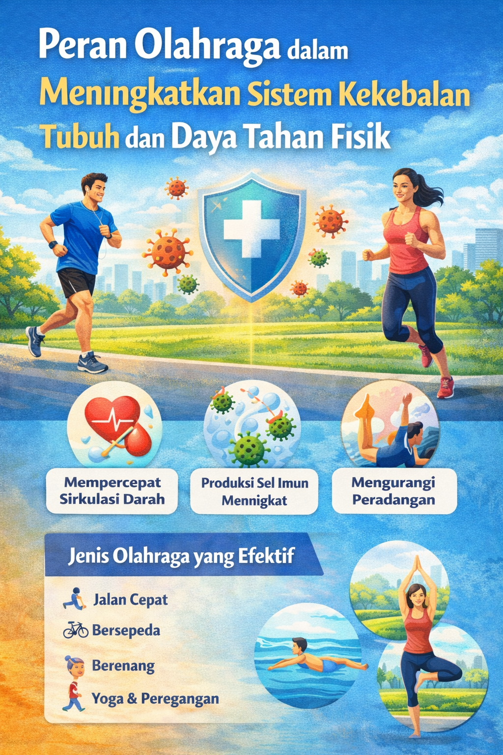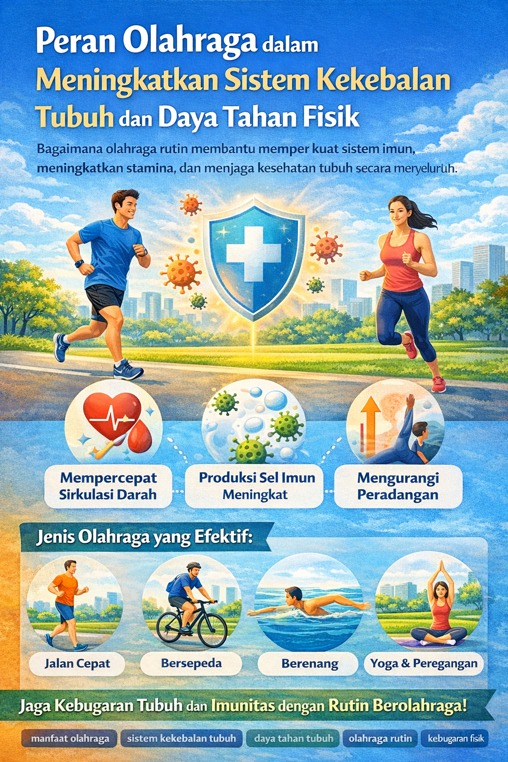 Di era modern, menjaga kesehatan menjadi semakin penting. Pola hidup yang kurang aktif, stres, dan paparan polusi sering kali membuat tubuh lebih rentan terhadap penyakit. Salah satu cara paling efektif untuk menjaga kesehatan dan meningkatkan daya tahan tubuh adalah melalui olahraga rutin. Olahraga tidak hanya membantu tubuh tetap bugar, tetapi juga berperan penting dalam memperkuat sistem kekebalan tubuh (imunitas) dan meningkatkan stamina fisik.