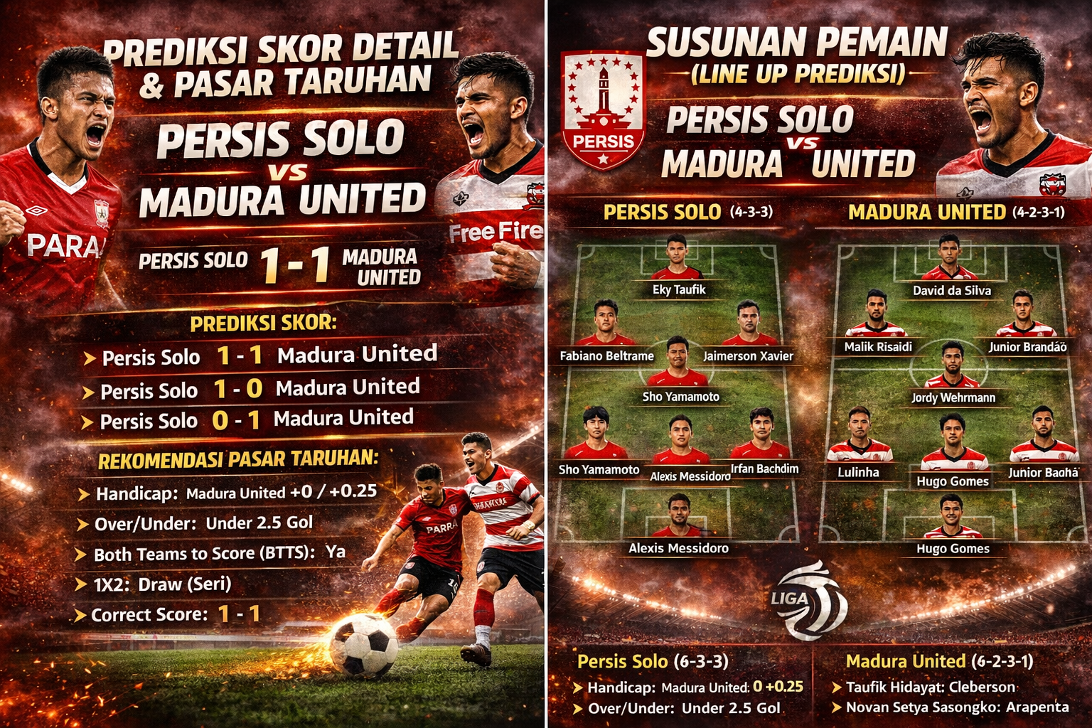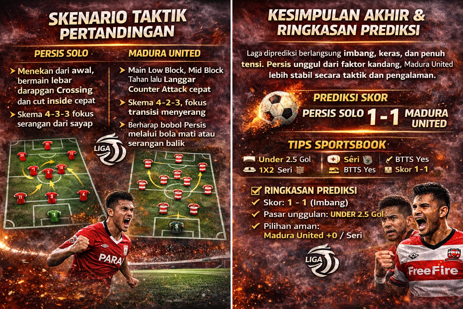 Persis unggul dari faktor kandang dan agresivitas, namun Madura United lebih stabil secara taktik dan pengalaman. Hasil imbang menjadi skenario paling masuk akal.