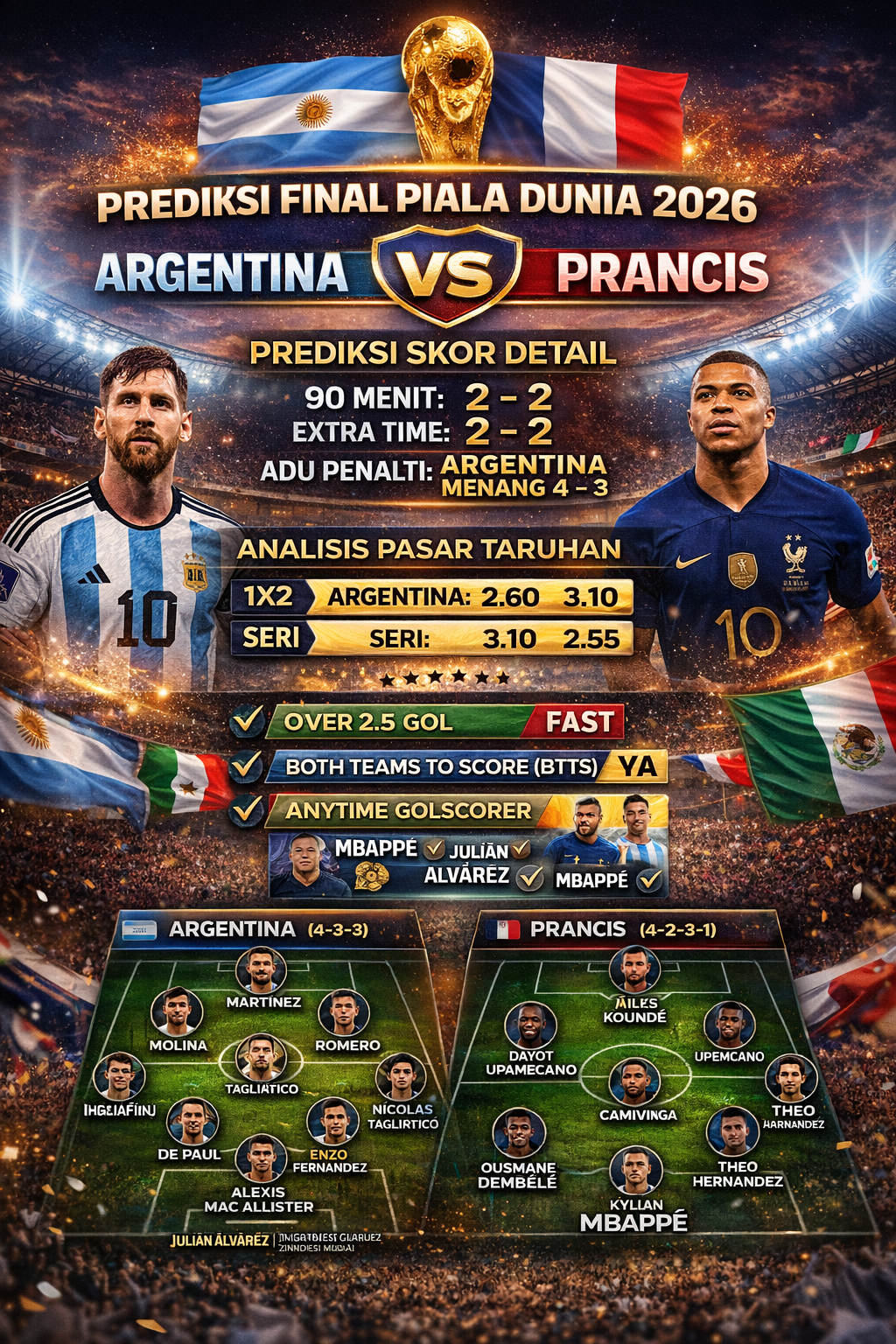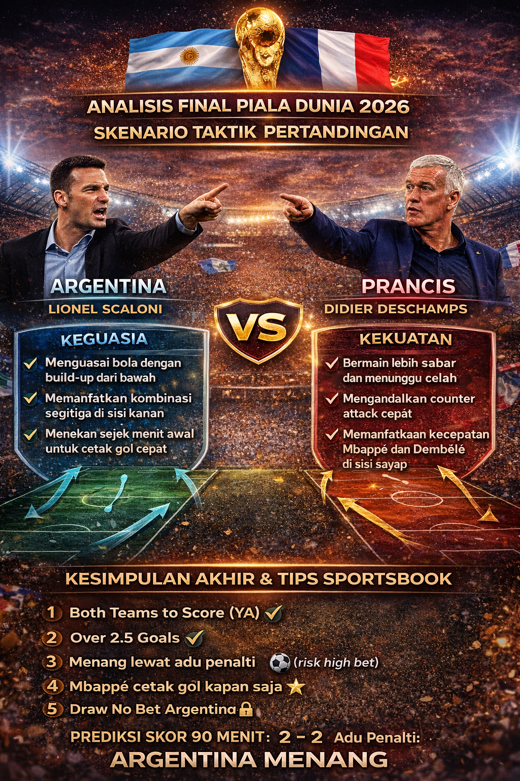 Final Piala Dunia 2026 diprediksi berlangsung ketat, penuh drama, dan kemungkinan besar berakhir hingga babak tambahan. Argentina memiliki mental juara dan ketenangan dalam adu penalti, sementara Prancis unggul dalam kecepatan dan kedalaman skuad.