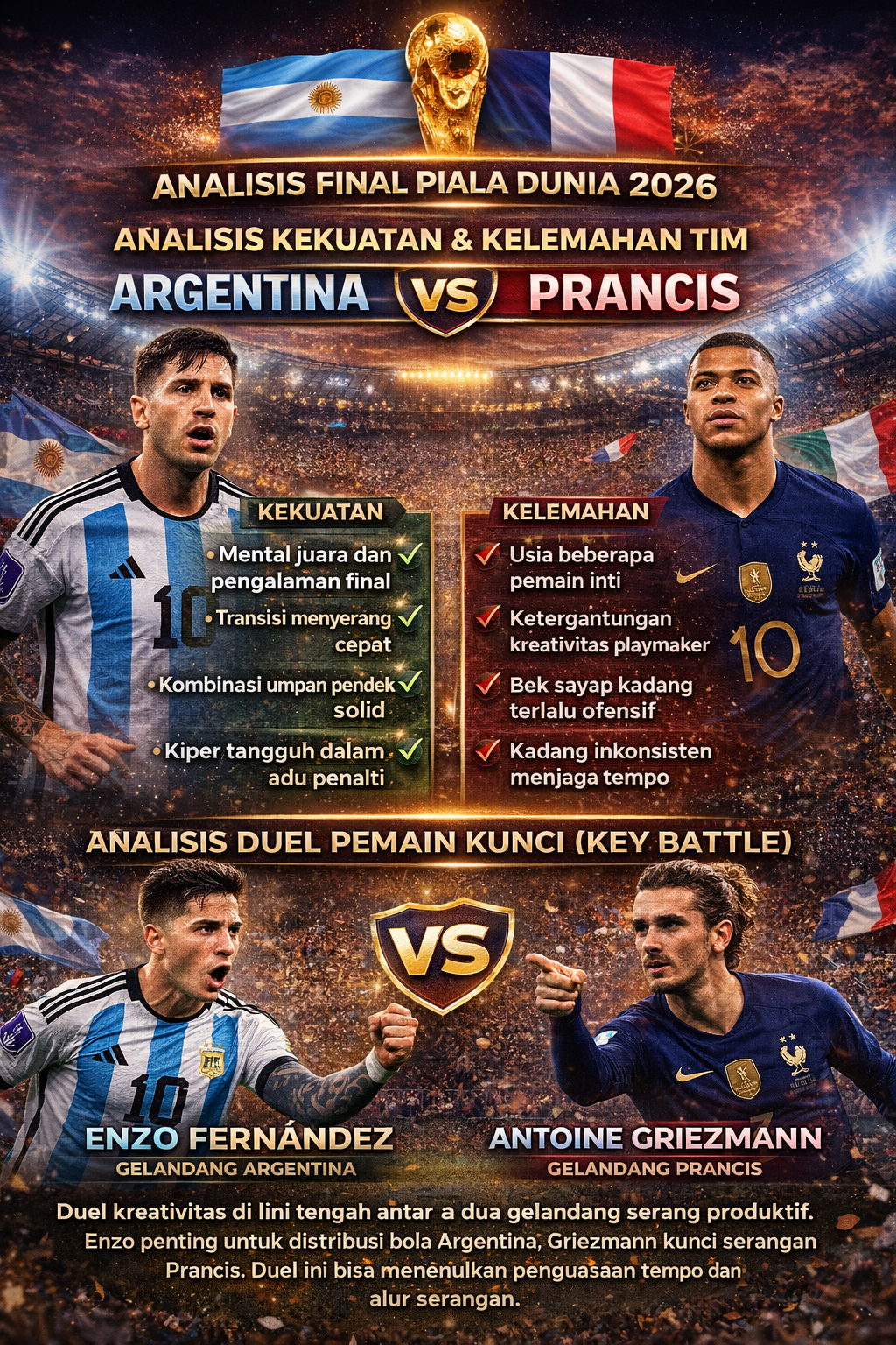 Pertarungan kreativitas lini tengah akan sangat menentukan. Enzo berperan sebagai pengatur ritme Argentina, sementara Griezmann menjadi motor serangan Prancis. Siapa yang mampu mengontrol tempo, berpeluang membawa timnya dominan.
