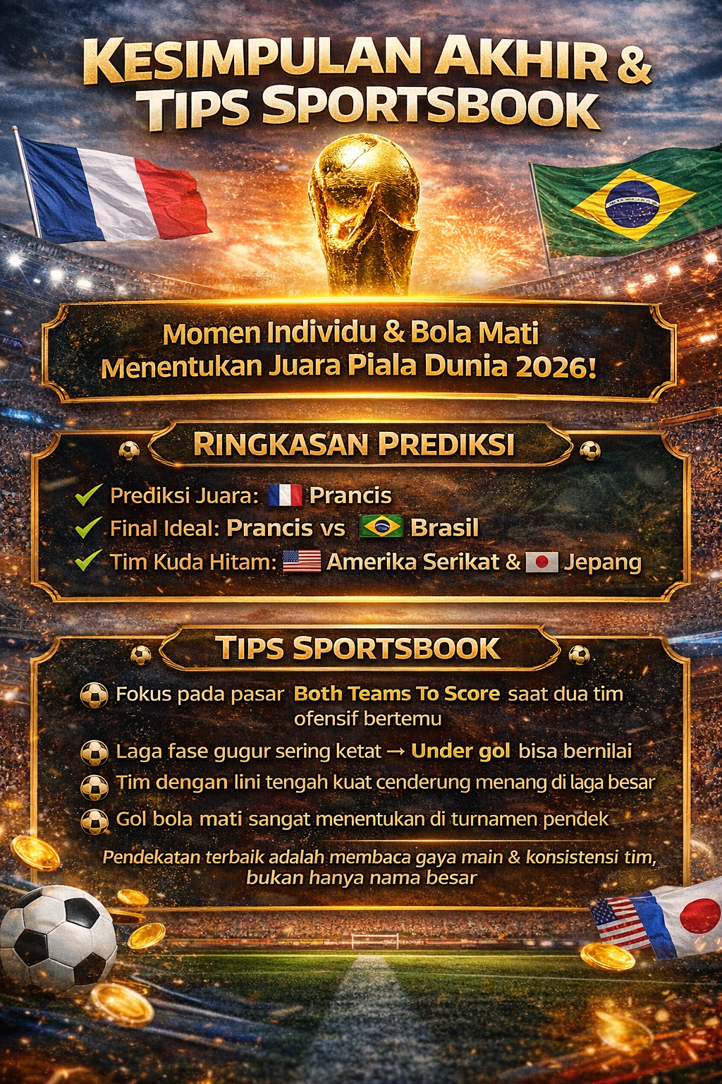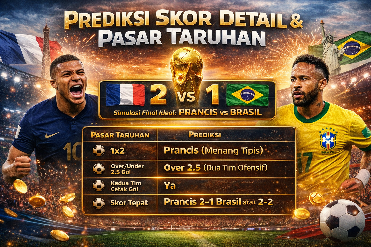Final Piala Dunia 2026 diprediksi menjadi duel kecepatan vs kreativitas. Prancis sedikit lebih unggul karena keseimbangan antara pertahanan solid dan serangan cepat. Namun Brasil punya potensi membalikkan keadaan lewat momen individu brilian.