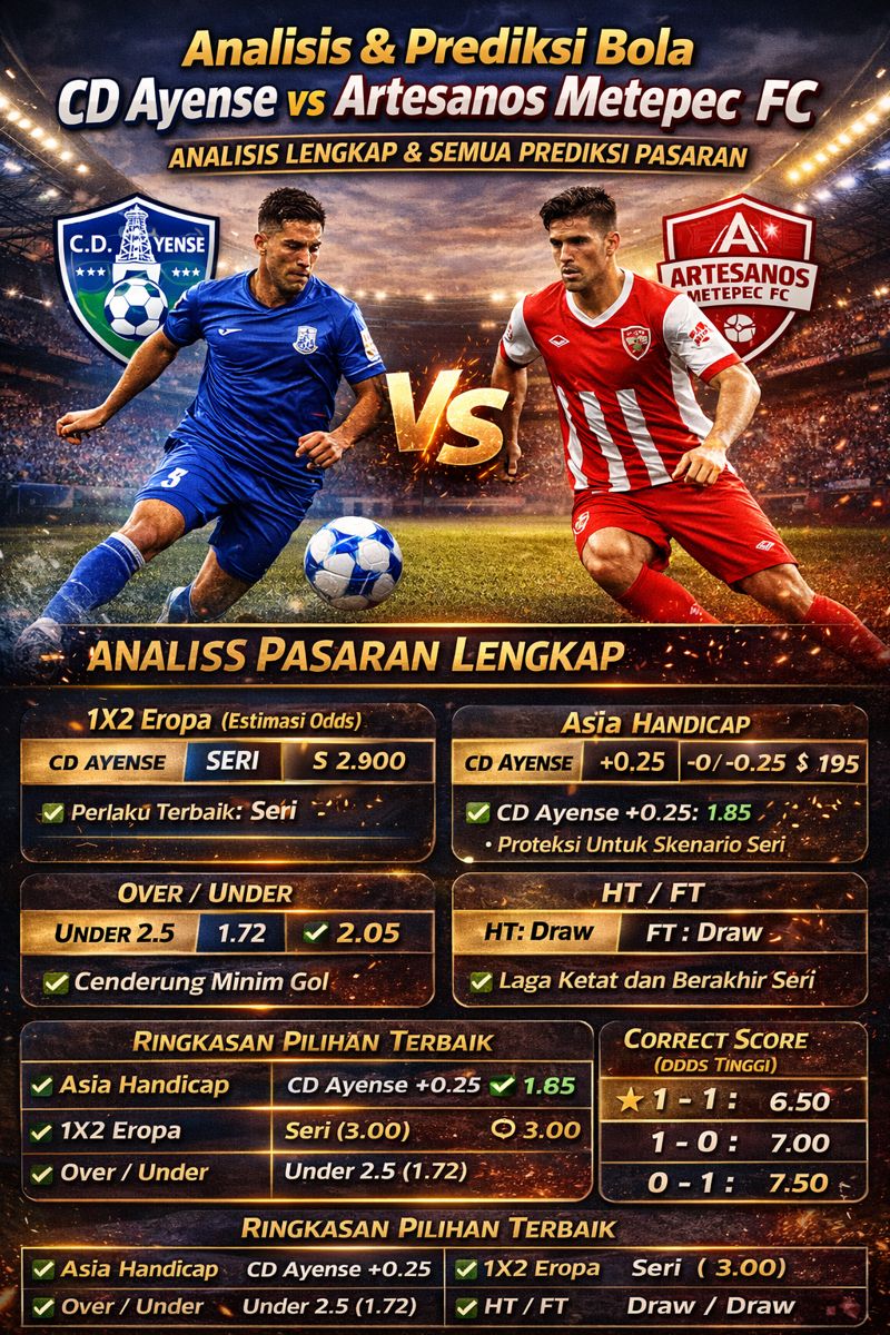 Laga CD Ayense vs Artesanos Metepec FC diprediksi berjalan imbang, minim gol, dan penuh kehati-hatian. Hasil seri menjadi skenario paling realistis dengan skor tipis.