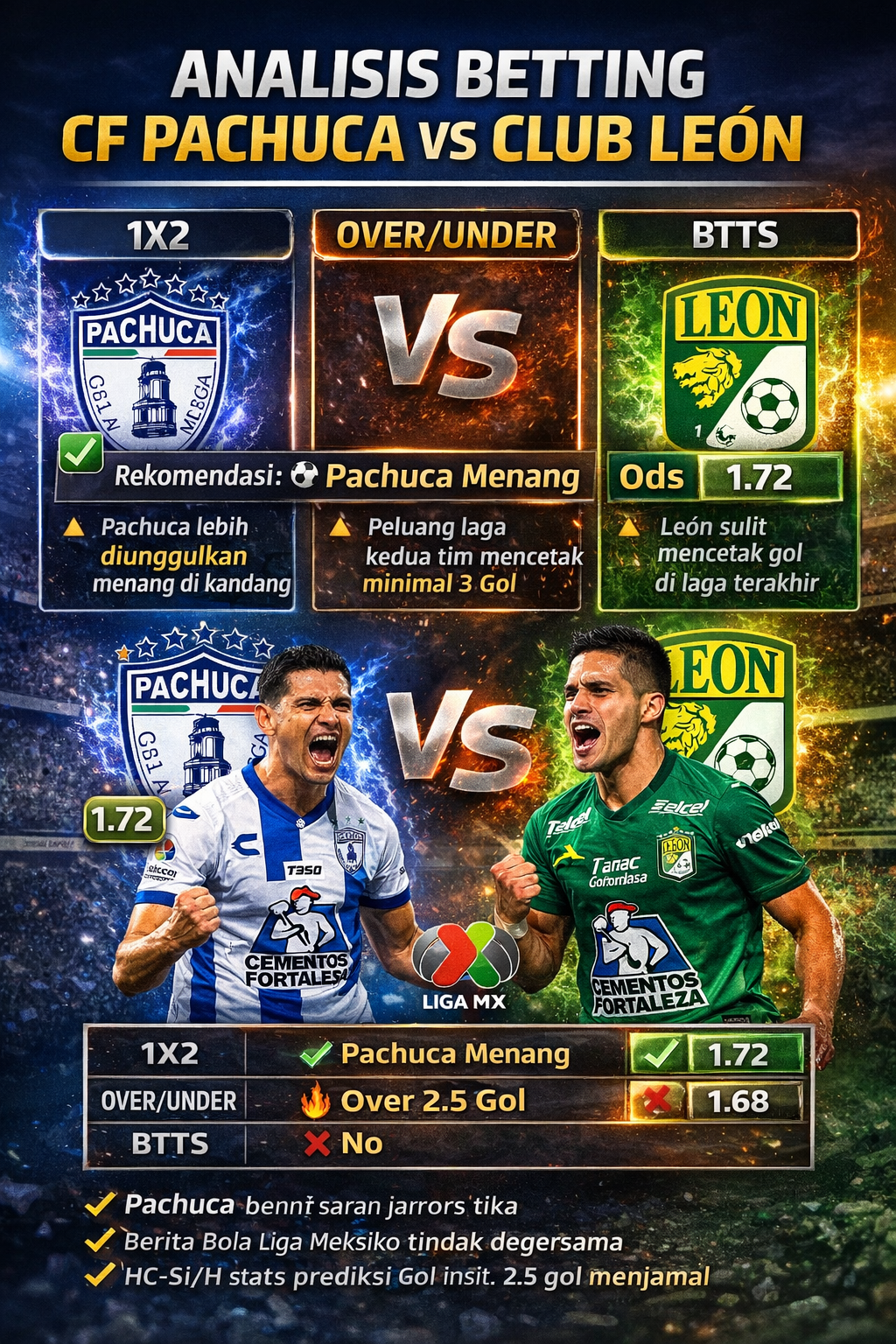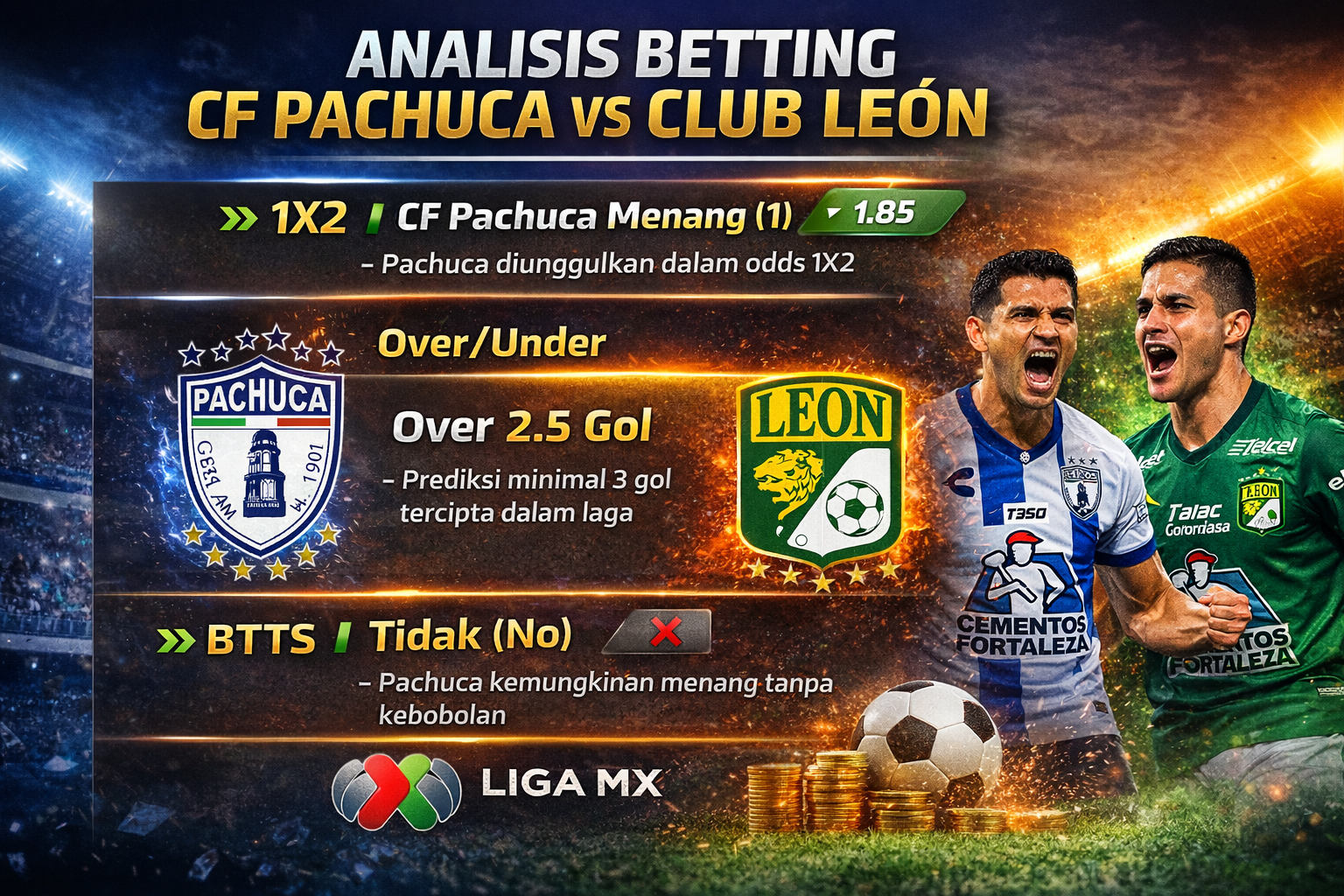 Berikut Analisis Betting (1X2, Over/Under, BTTS) untuk pertandingan CF Pachuca vs Club León — berdasarkan data statistik, tren terbaru, odds pasar, dan performa kedua tim: