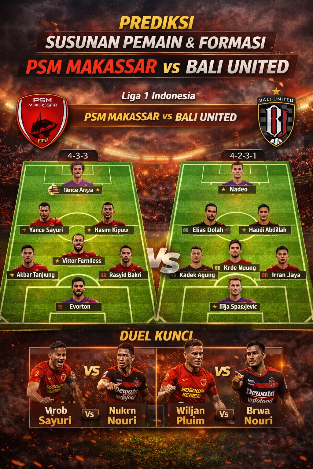 PSM Makassar vs Bali United Pusam FC, disusun dengan pendekatan taktikal ala analis pertandingan & sportsbook, menggunakan nama pemain yang umum dipakai dan fleksibel terhadap rotasi.