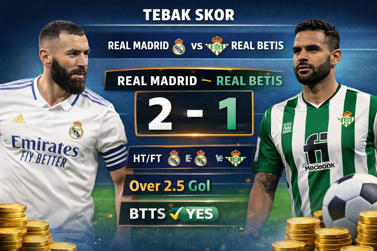- Real Madrid 3 – 1 Real Betis (jika Madrid dominan sejak babak pertama)