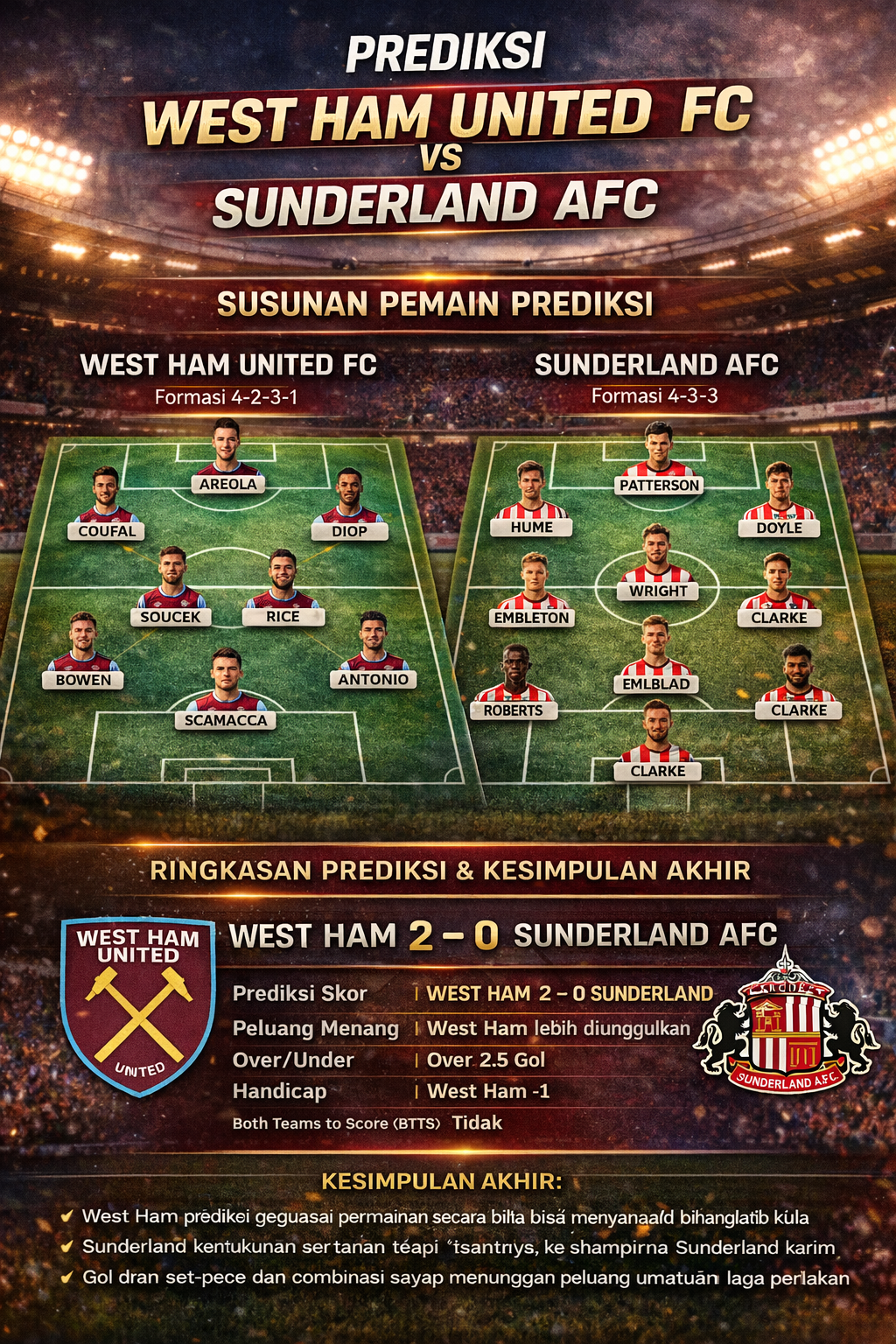 → West Ham lebih diunggulkan, tapi Sunderland tetap punya peluang jika berhasil memanfaatkan kesalahan lawan.