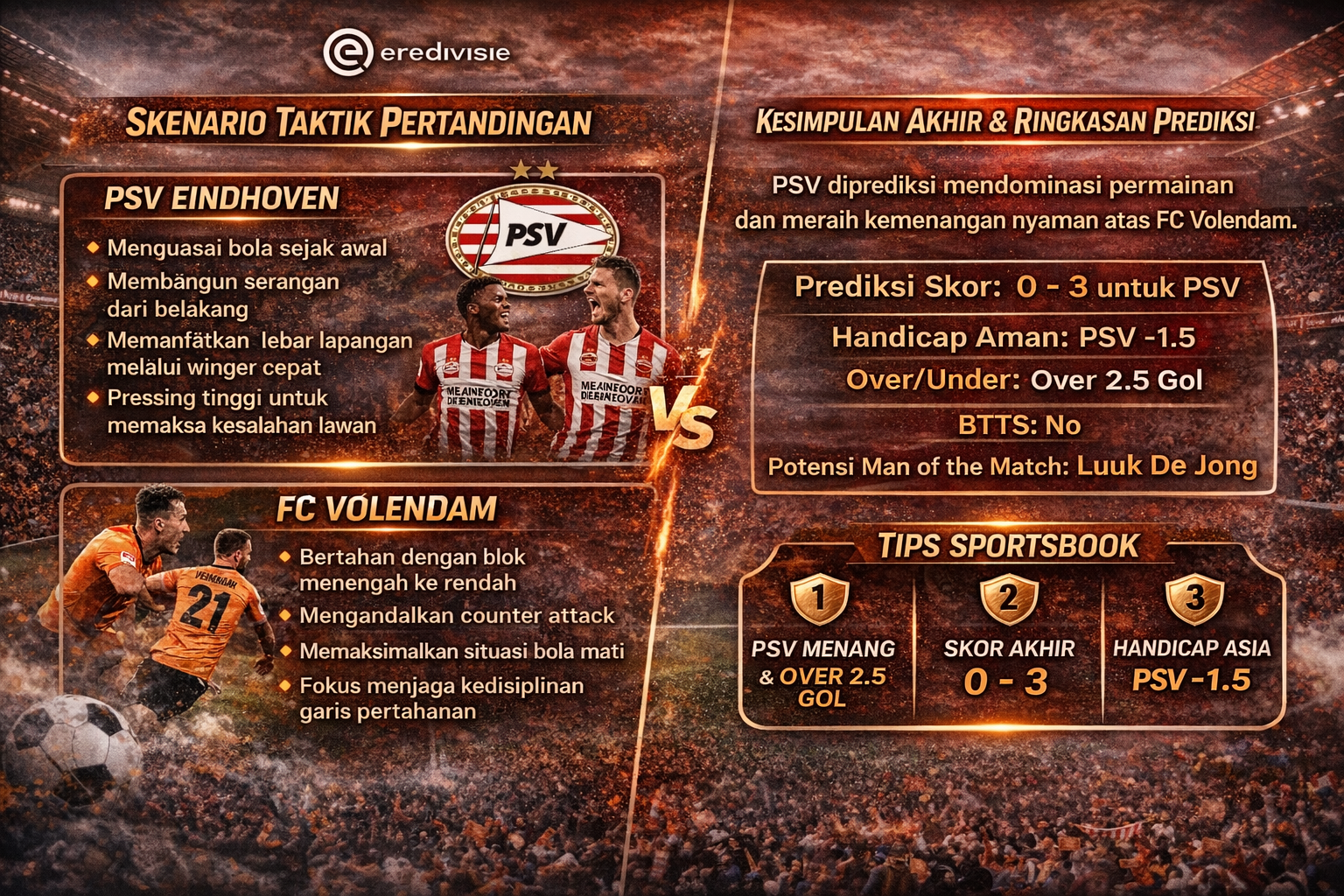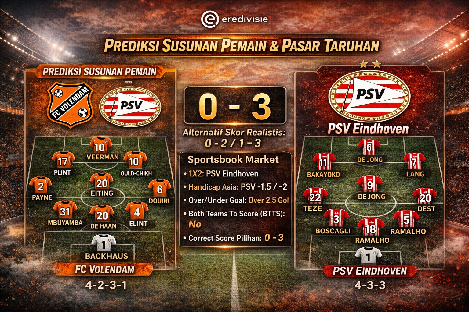 Melanjutkan pembahasan laga FC Volendam kontra PSV Eindhoven, berikut adalah ulasan mendalam mencakup prediksi skor, pasar taruhan, line up prediksi, hingga analisis taktik kedua tim.
