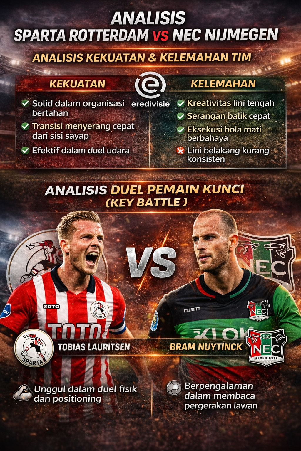 Duel antara striker Sparta dan bek senior NEC akan sangat menentukan. Lauritsen unggul dalam duel fisik dan positioning, sementara Nuytinck berpengalaman dalam membaca pergerakan lawan.