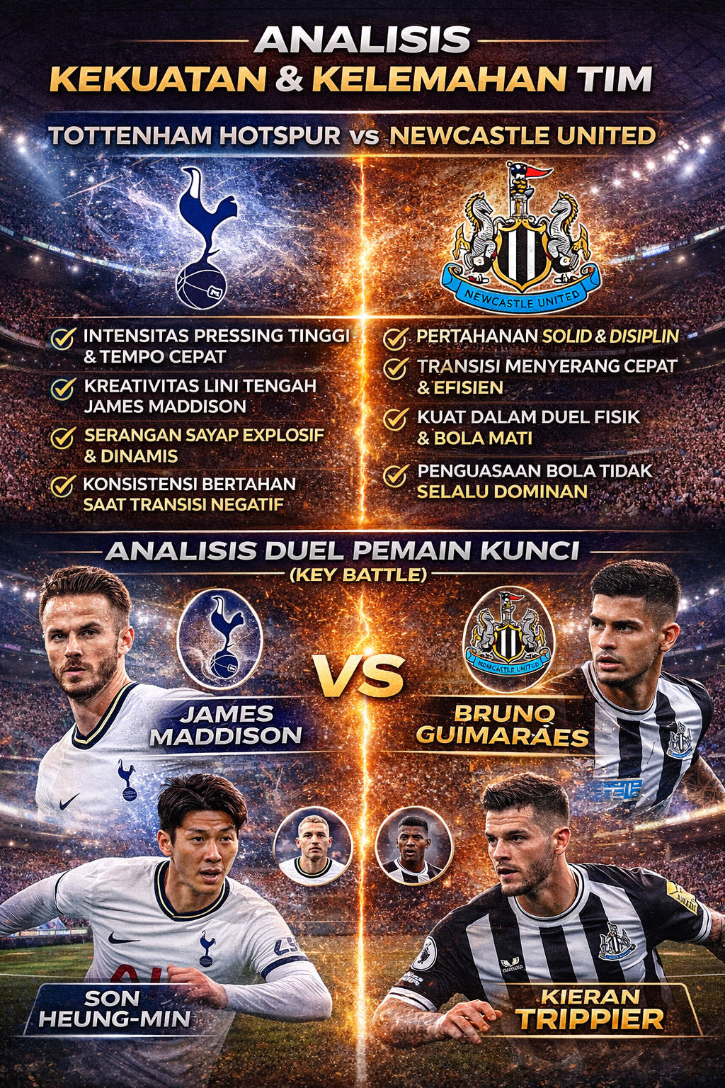 Pertarungan lini tengah akan menjadi kunci utama dalam laga ini. Tim yang mampu menguasai tempo permainan berpeluang besar mendominasi jalannya pertandingan. Selain itu, duel antara bek Tottenham melawan penyerang Newcastle akan sangat menentukan hasil akhir, terutama dalam mengantisipasi bola-bola mati dan serangan balik cepat.