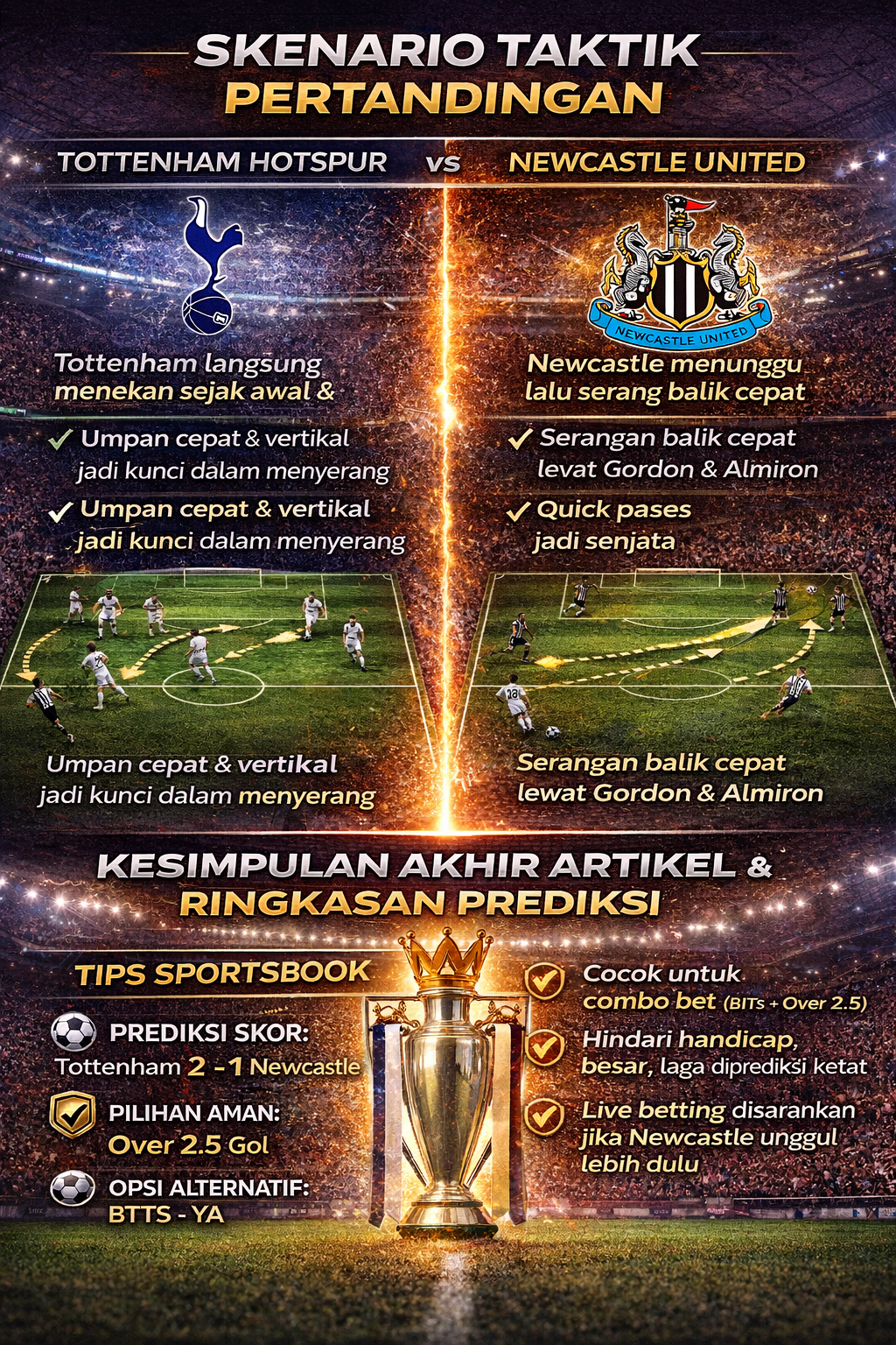 Pertandingan Tottenham vs Newcastle diprediksi berlangsung sengit dengan intensitas tinggi sepanjang laga. Tottenham memiliki keunggulan kandang dan kreativitas serangan, sementara Newcastle menawarkan disiplin dan efektivitas dalam transisi.