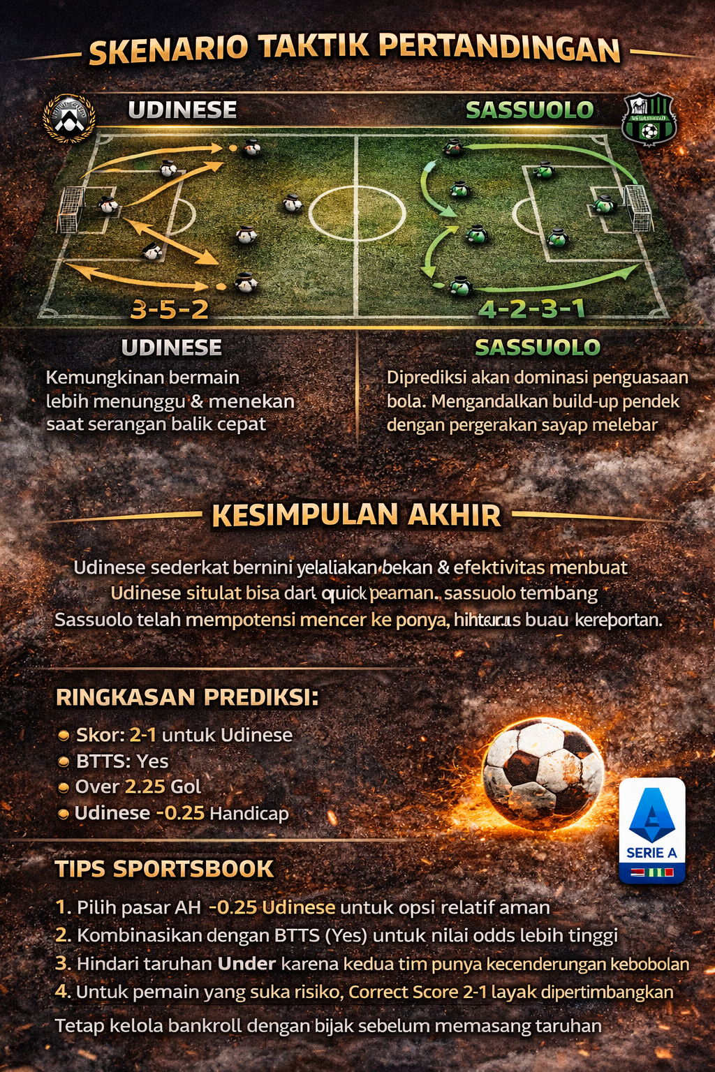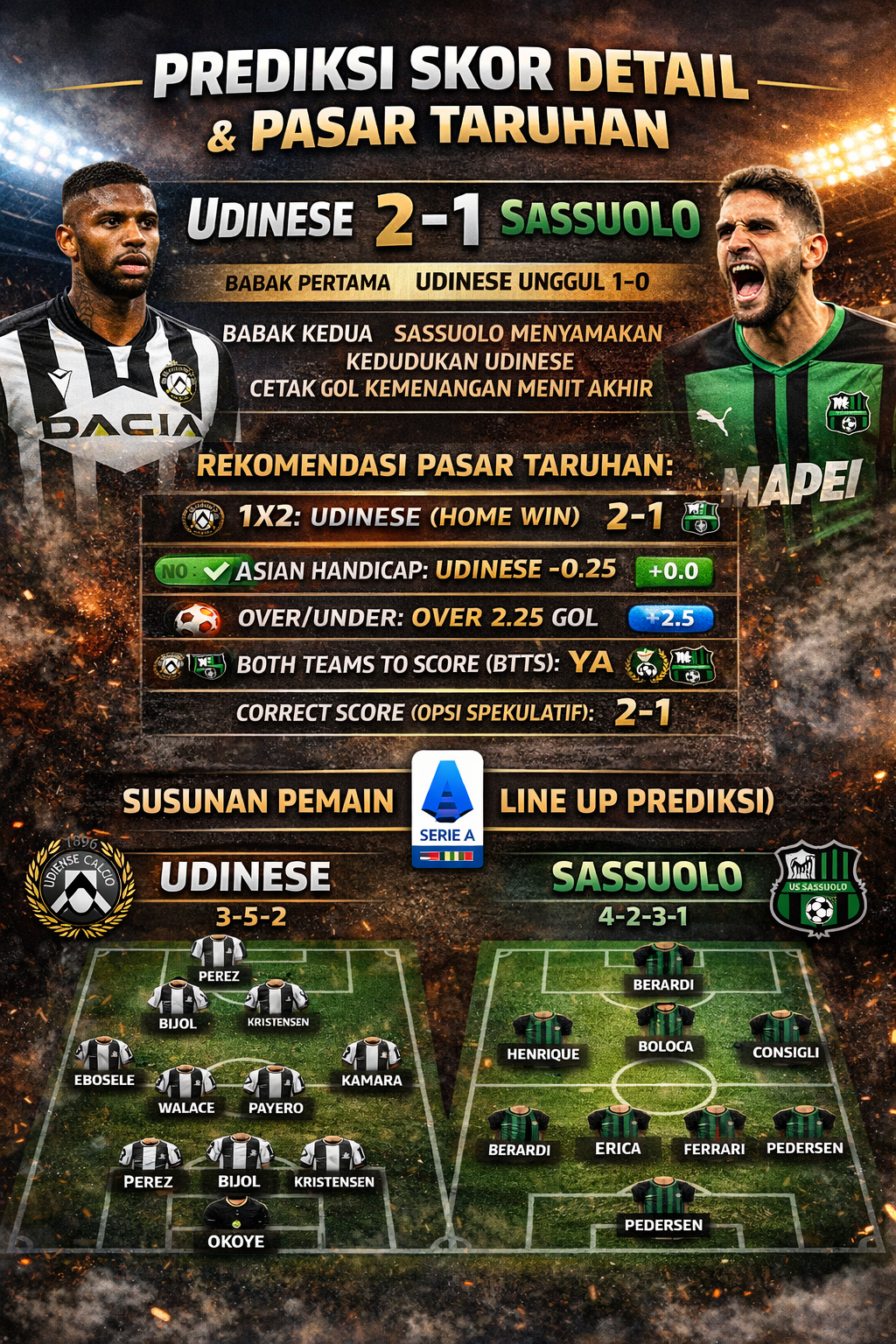 Jika Udinese mencetak gol lebih dulu, laga bisa berubah menjadi duel terbuka dengan Sassuolo meningkatkan risiko menyerang.