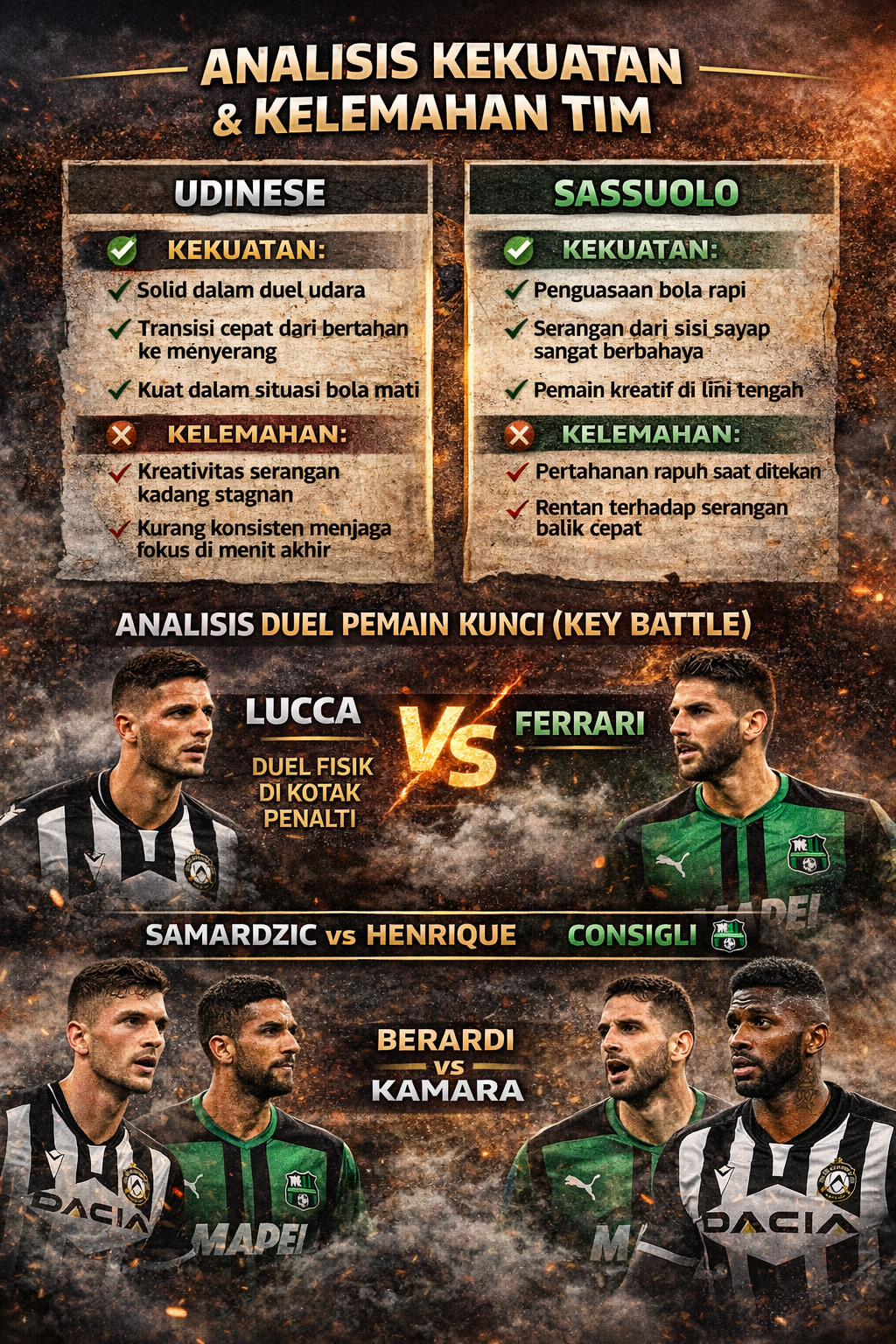 Pertandingan ini berpotensi berjalan seimbang, namun faktor kandang dan efektivitas peluang membuat Udinese sedikit lebih diunggulkan. Sassuolo tetap memiliki potensi mencetak gol, terutama melalui serangan sayap dan kreativitas lini tengah.